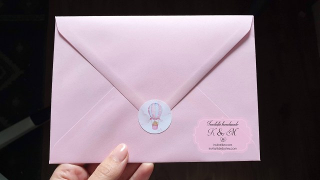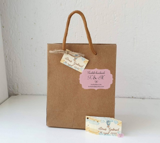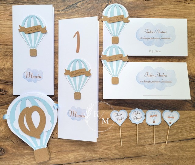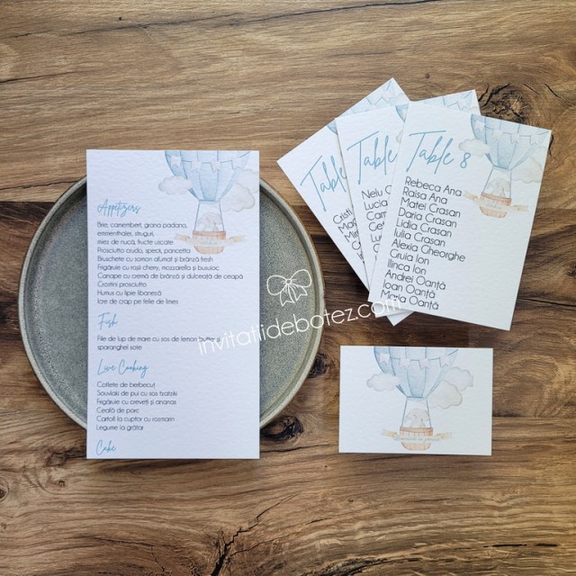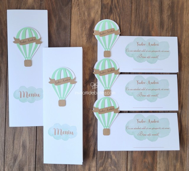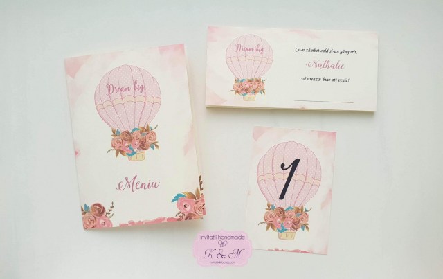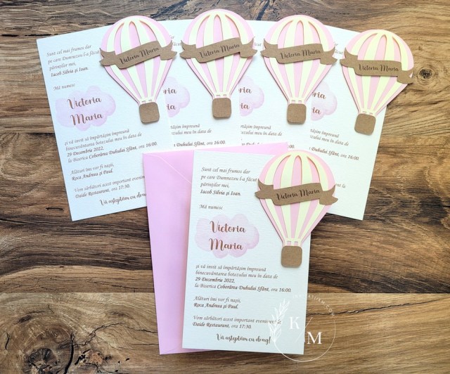 Meniuri, Plicuri bani pentru botez cu balon cu aer cald roz, alb, kraft 23/09/202426/11/2025