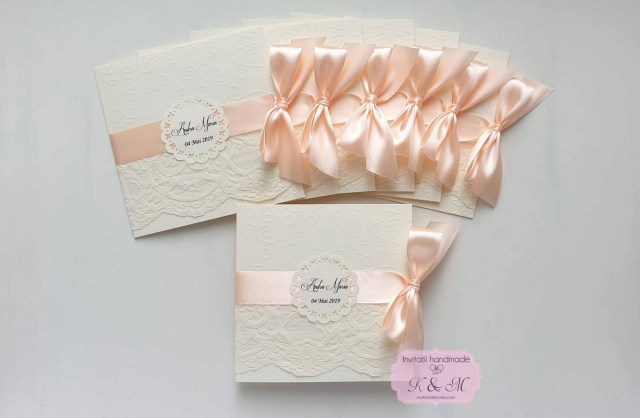 Invitatii de botez pentru fetite cu dantela si panglica somon, cod 237 05/05/201926/02/2024