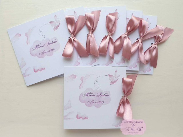 Invitatii de botez pentru fetite cu nori, fluturi si fundita roz antic, cod 230 05/05/201926/02/2024