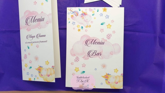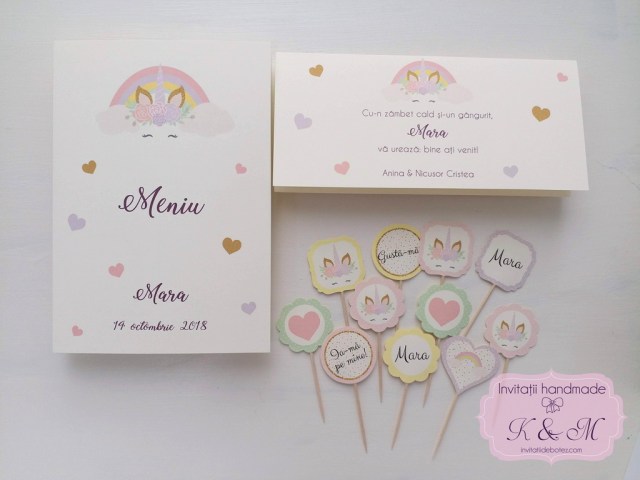 Meniu, numar masa, plic bani, mesaje candy bar cu unicorni si inimioare cod 222 11/10/201926/02/2024