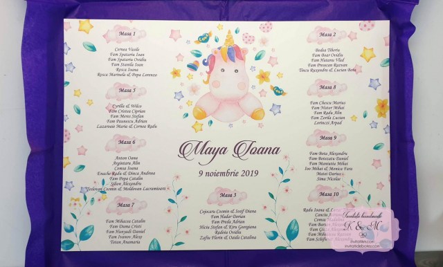 Lista de asezare a invitatilor la mese cu unicorn si stelute colorate cod 259 19/11/201906/09/2023