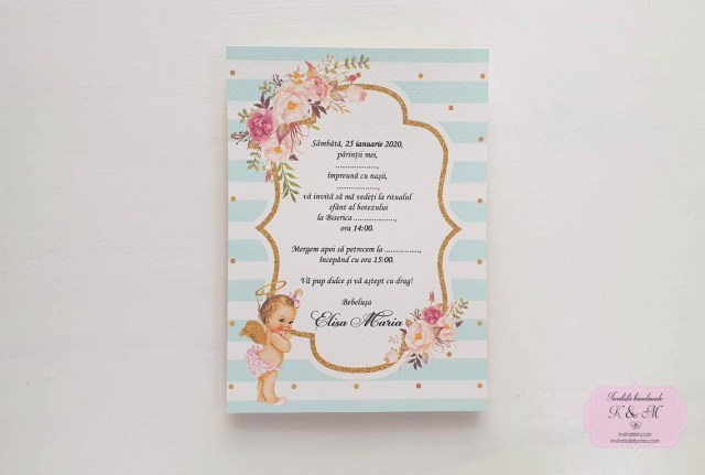 Invitatii handmade de botez, invitatii digitale de botez, panouri bun venit, meniuri, plicuri de bani, mesaje candy bar, etichete marturii, globuri de Craciun. Produsele personalizate se pot achita in avans in cont. Contact: invitatiikm@gmail.com sau 0744917065