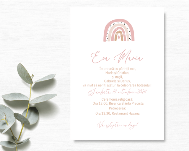 Invitatie online de botez in stil boho cu rochita si jucarii pentru fetita 29/02/202405/02/2025