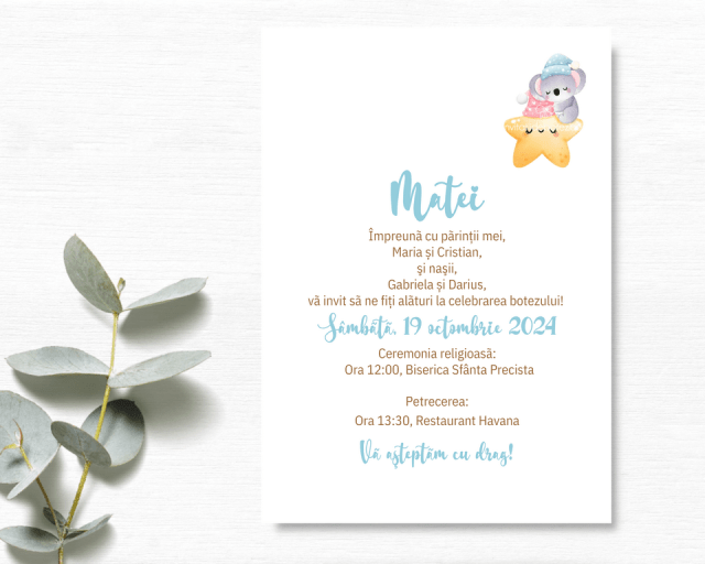 Invitatie digitala de botez cu ursulet Koala pentru baietel 28/02/202405/02/2025