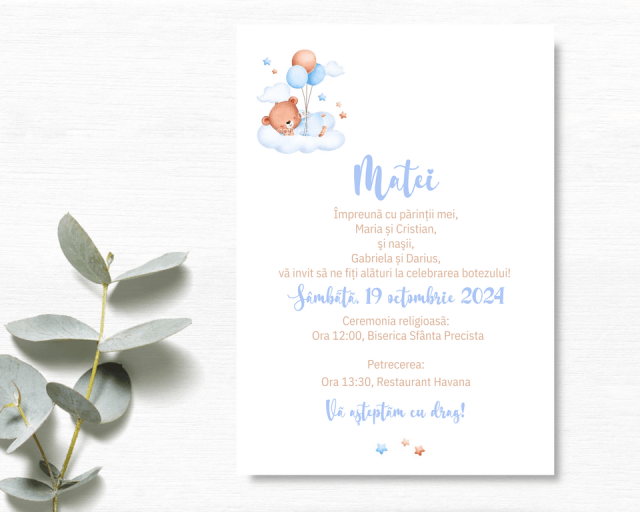 Invitatie de botez online cu ursulet si baloane pentru baiat 05/03/202405/02/2025