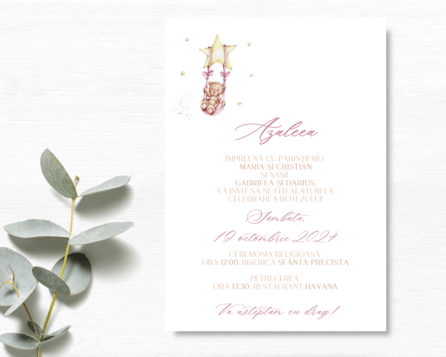 Invitatii de botez cu ursuleti si stelute roz si galbene cod 247 19/11/201926/02/2024