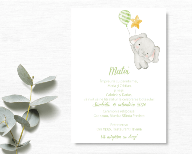 Invitatii de botez online cu elefant si baloane pentru baiat 02/03/202405/02/2025