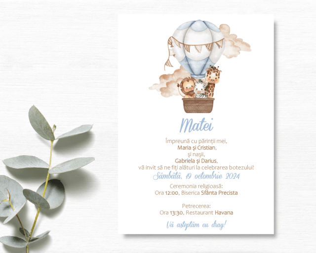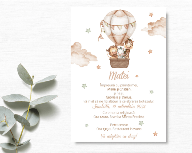 Invitatie de botez digitala safari si balon aer cald bej pentru baiat 29/02/202405/02/2025