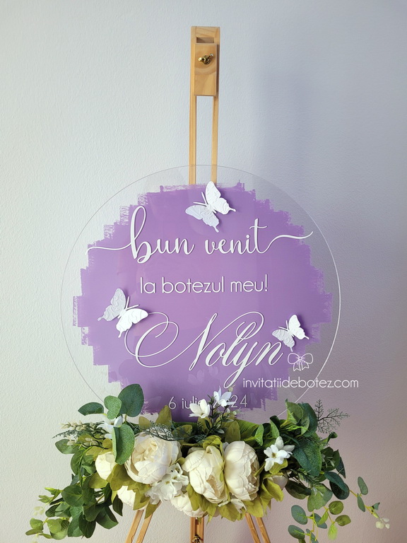 Panou plexiglas rotund de intampinare pentru botez lila si alb si fluturasi 15/06/202411/07/2025