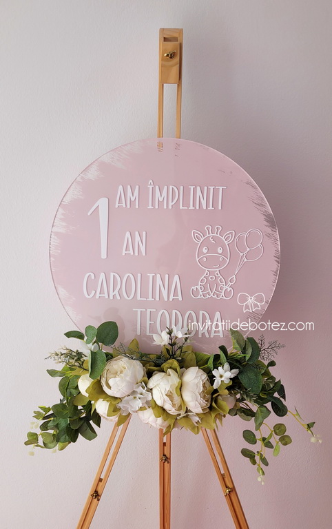 Panou plexiglas rotund aniversare 1 an roz antic si alb, cu girafa 15/06/202411/07/2025