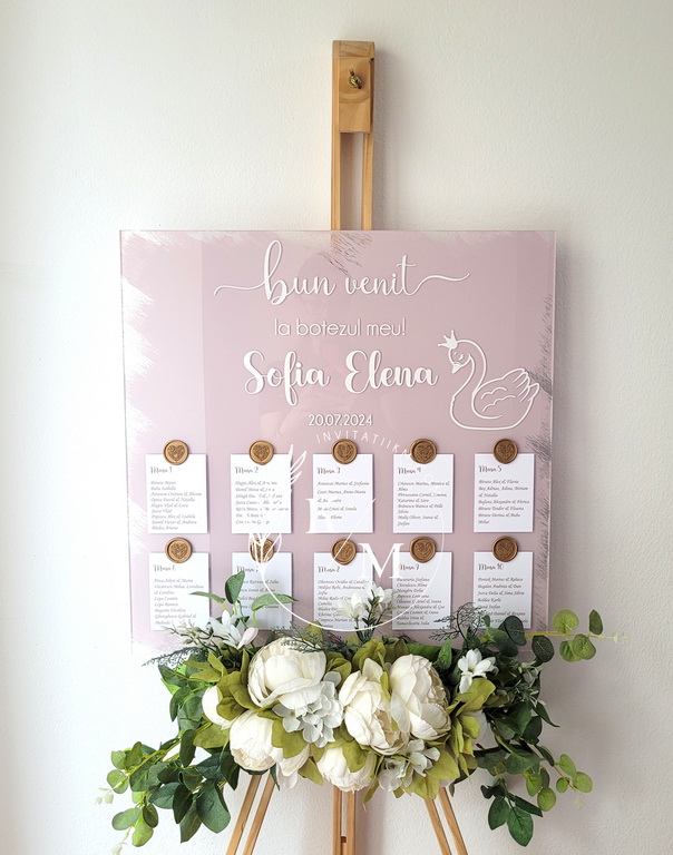 Panou cu asezarea invitatilor la mese pentru botez cu lebada 19/02/202504/06/2025