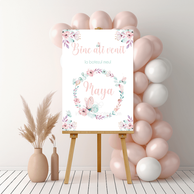 Panou Bun Venit Botez cu flori pastelate si fluturasi 18/02/2025