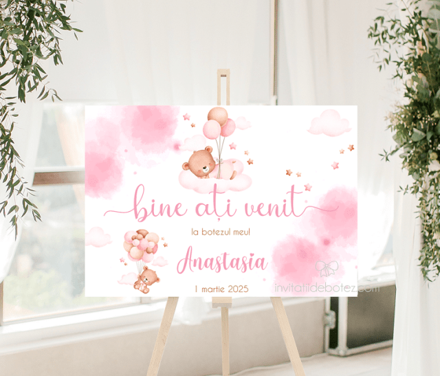 Panou Bun Venit la Botez cu ursulet in balon cu aer cald roz 18/02/202518/02/2025