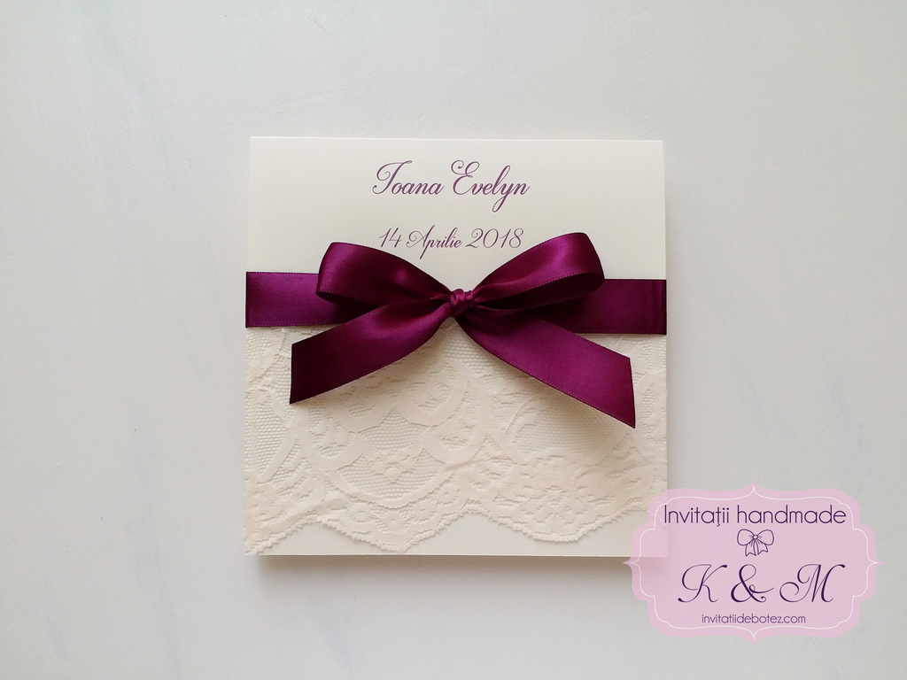 Invitatie de nunta realizata din carton ivory, dantela si fundita din satin. Este realizata tip felicitare, cu deschidere de jos in sus.