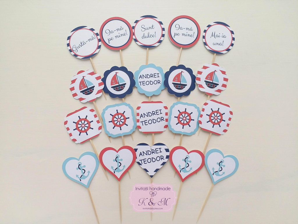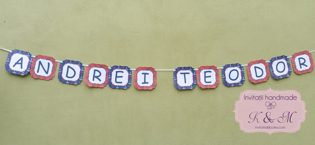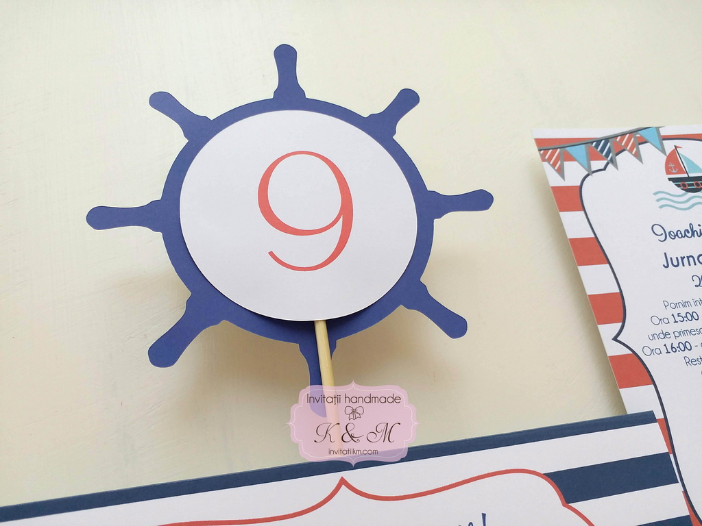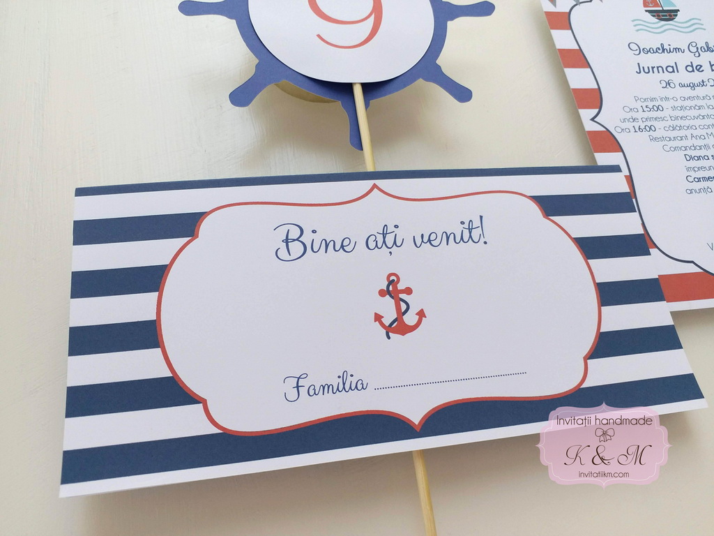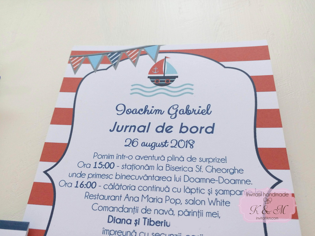 Invitatie de botez cu tema marina realizata din carton gros alb neted cu plic asortat inclus, plic de bani, numar de masa in forma de timona