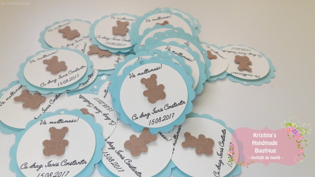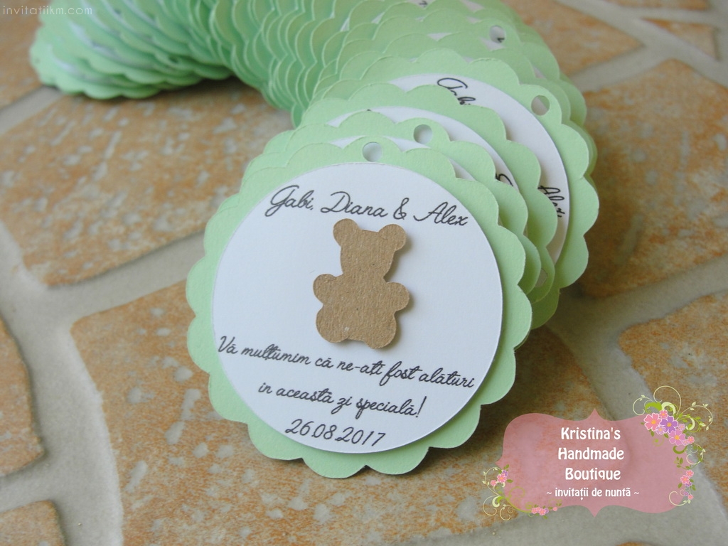 Etichete pentru marturii realizate din carton colorat, carton alb/ivory cu text si ursulet decupat din carton reciclat. Nu au panglica.