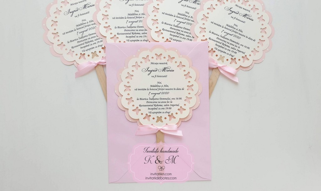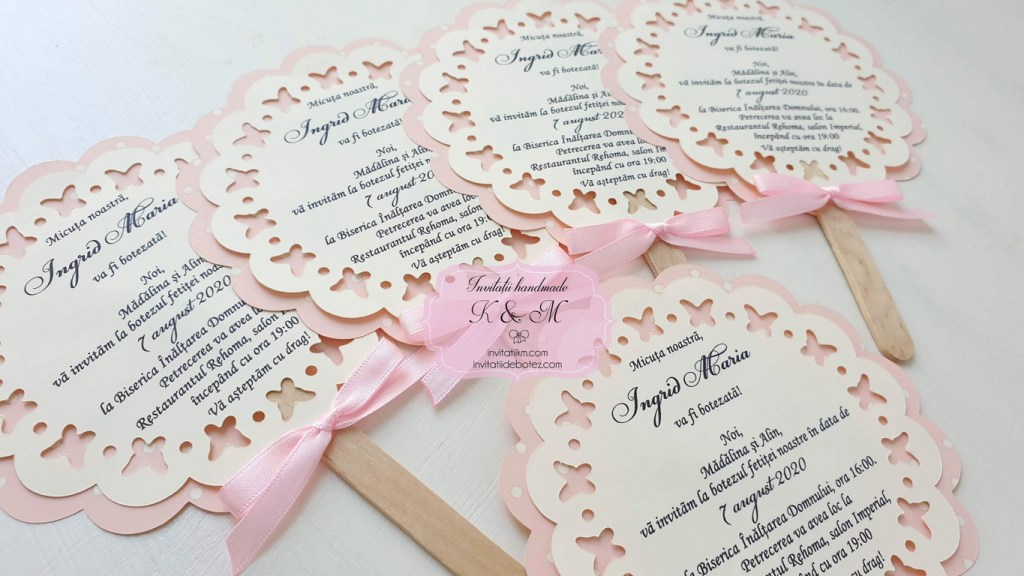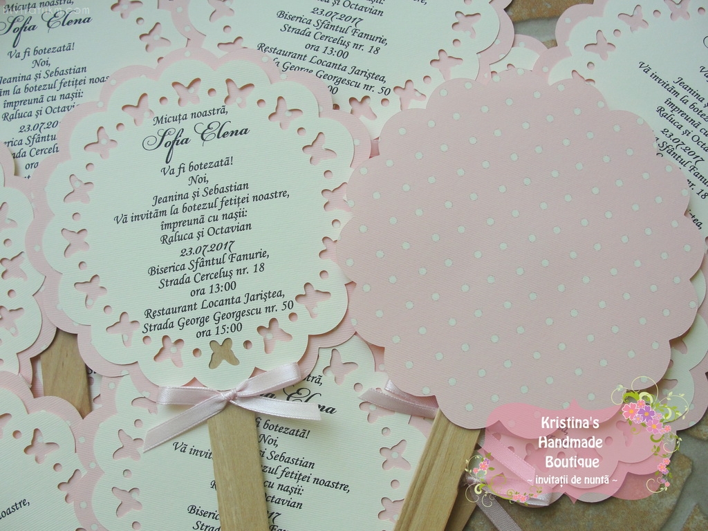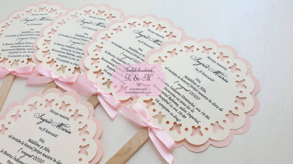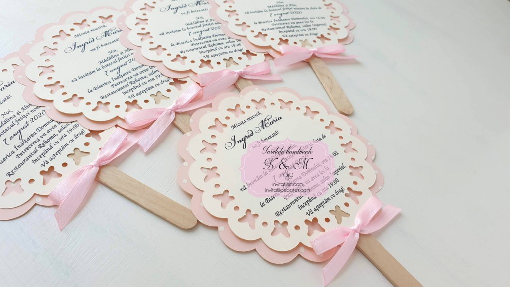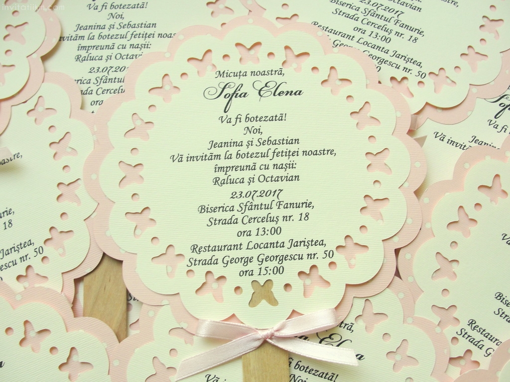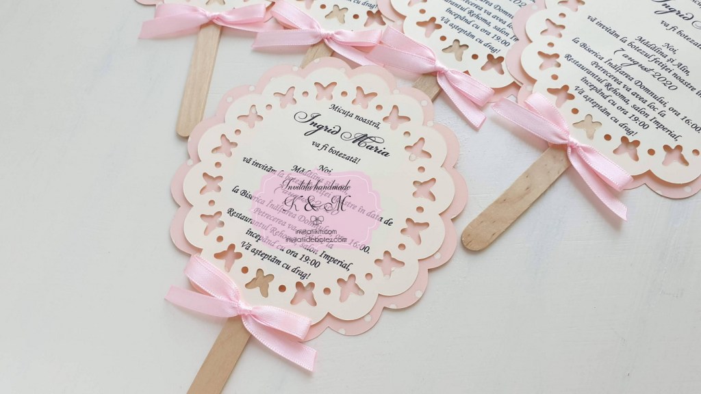 Invitatie de botez handmade pe betisor de inghetata, accesorizata cu o fundita colorata, cu margine perforata cu fluturasi