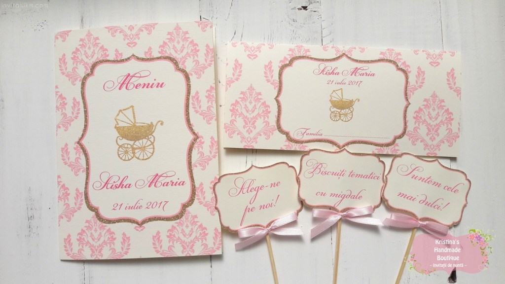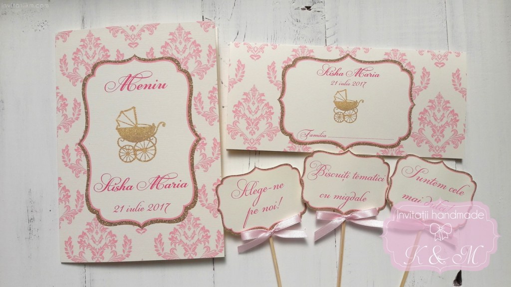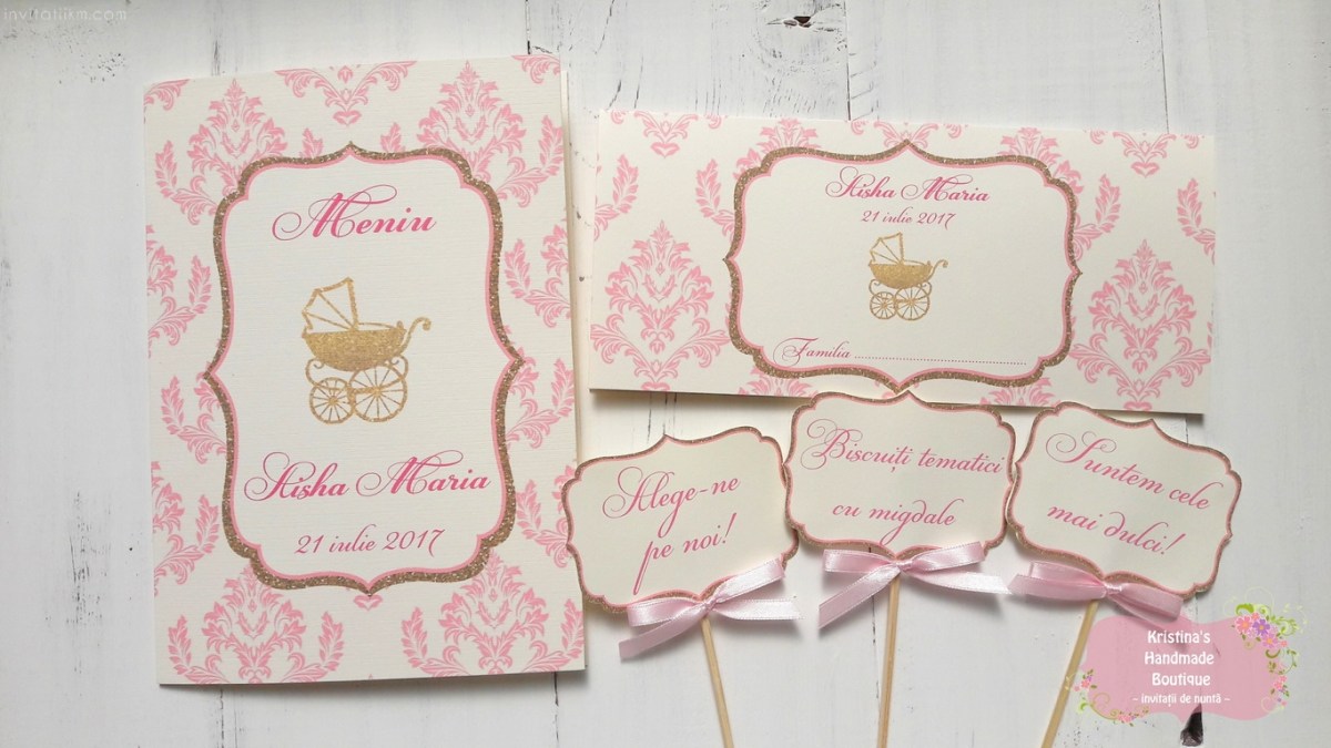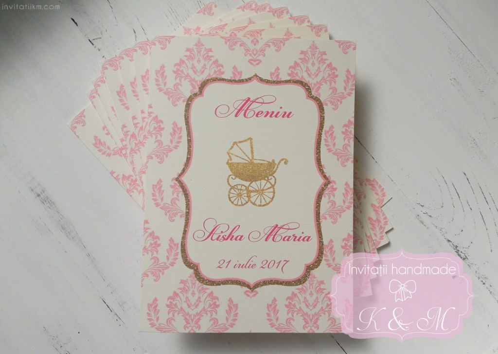 Meniu si plic de bani/card asezare de botez cu damask roz si carucior glitter printat