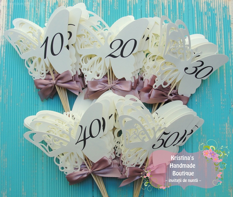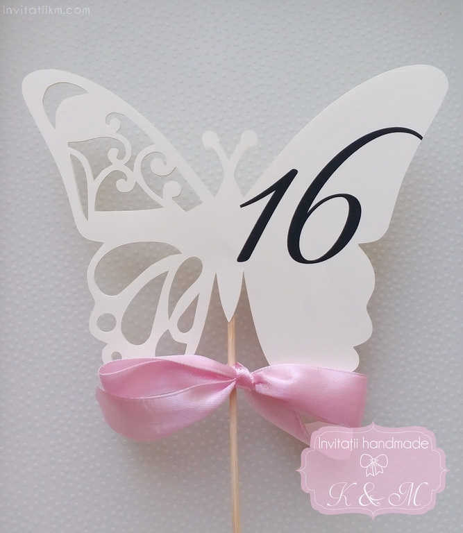 Numar de masa fata-verso in forma de fluture cu panglica de satin pe betisor de bambus. Poate fi pus in aranjamentul floral.
