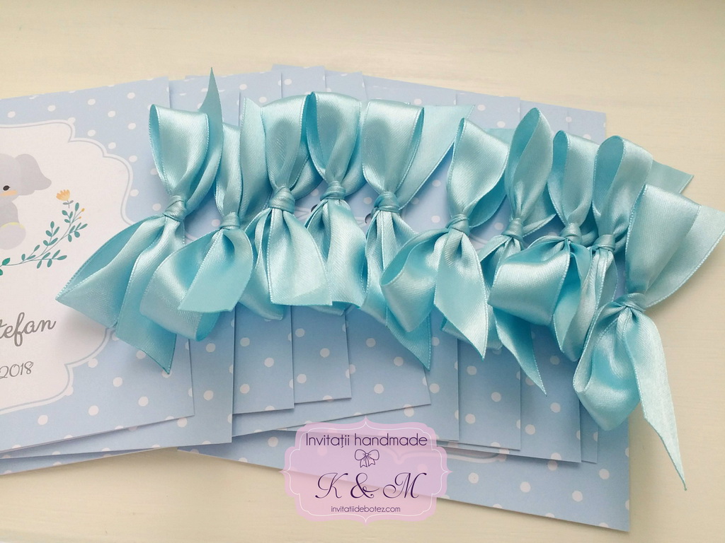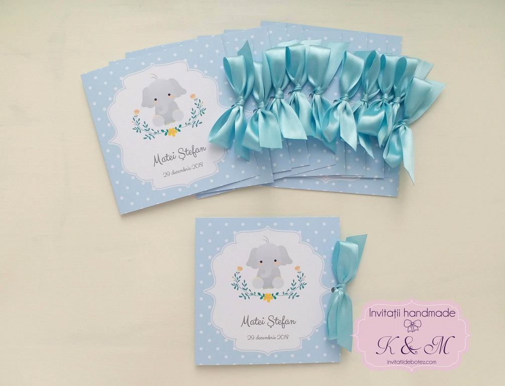 Invitatie de botez cu elefant realizata din carton gros alb, legata cu panglica satinata. Nu necesita plic