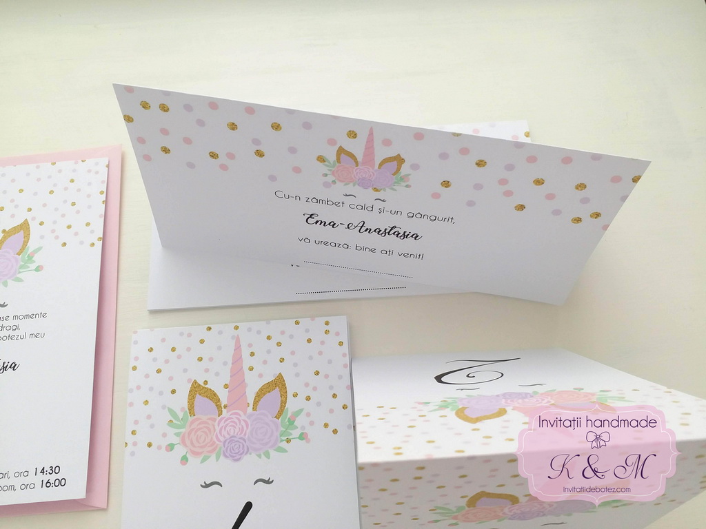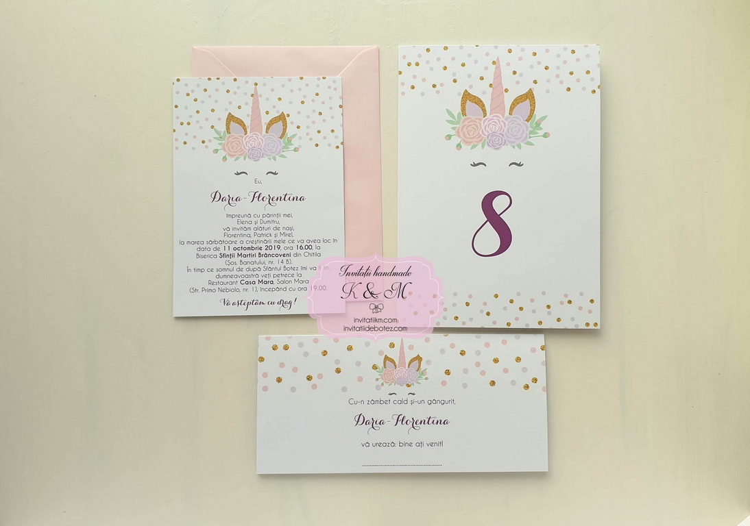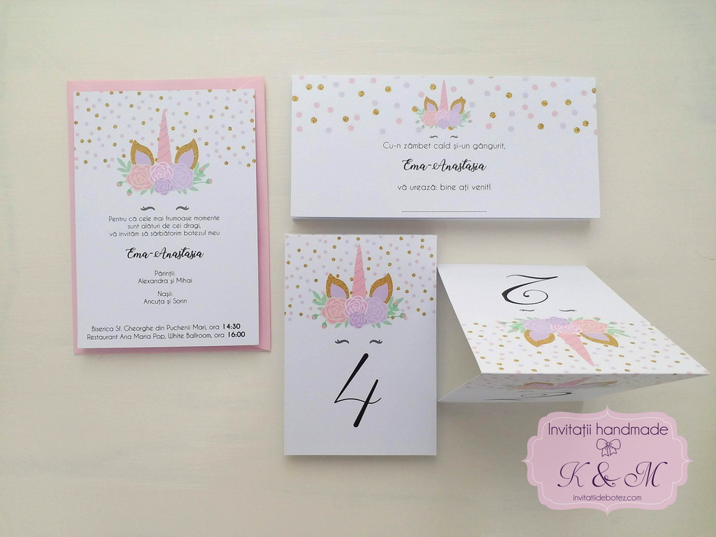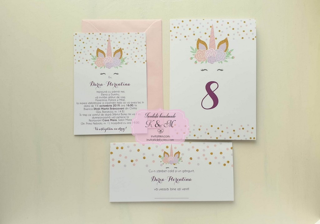 Invitatii de botez realizate din carton gros alb si unicorni printati + plic inclus; numere de masa, plicuri de bani cu unicorni