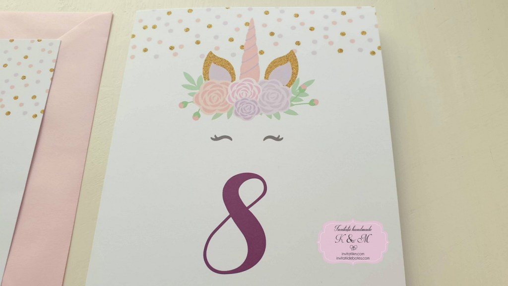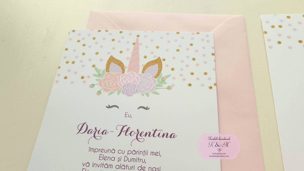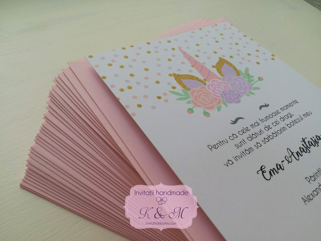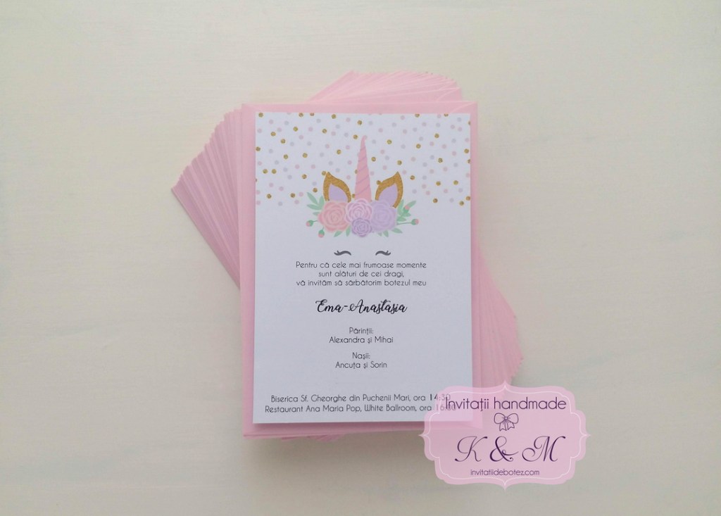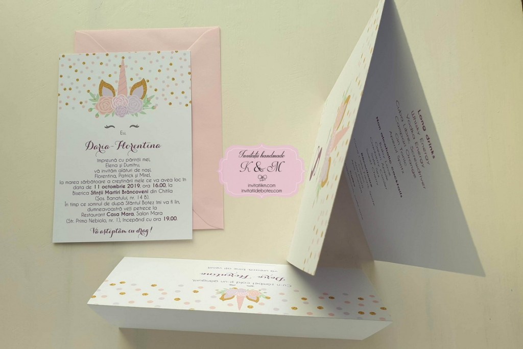 Invitatii de botez realizate din carton gros alb si unicorni printati + plic inclus; numere de masa, plicuri de bani cu unicorni