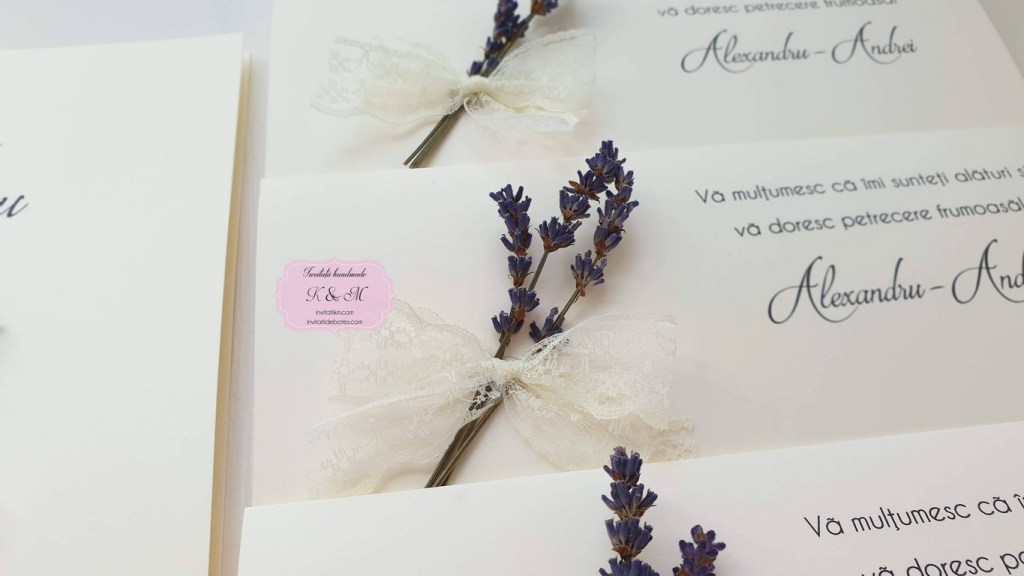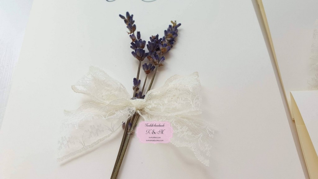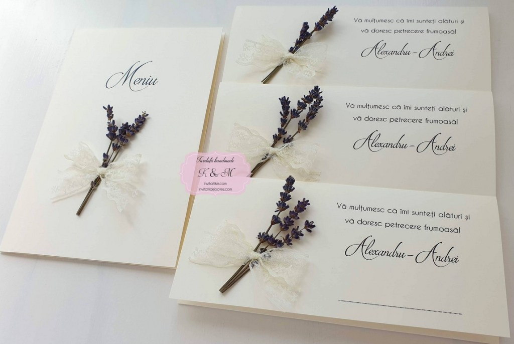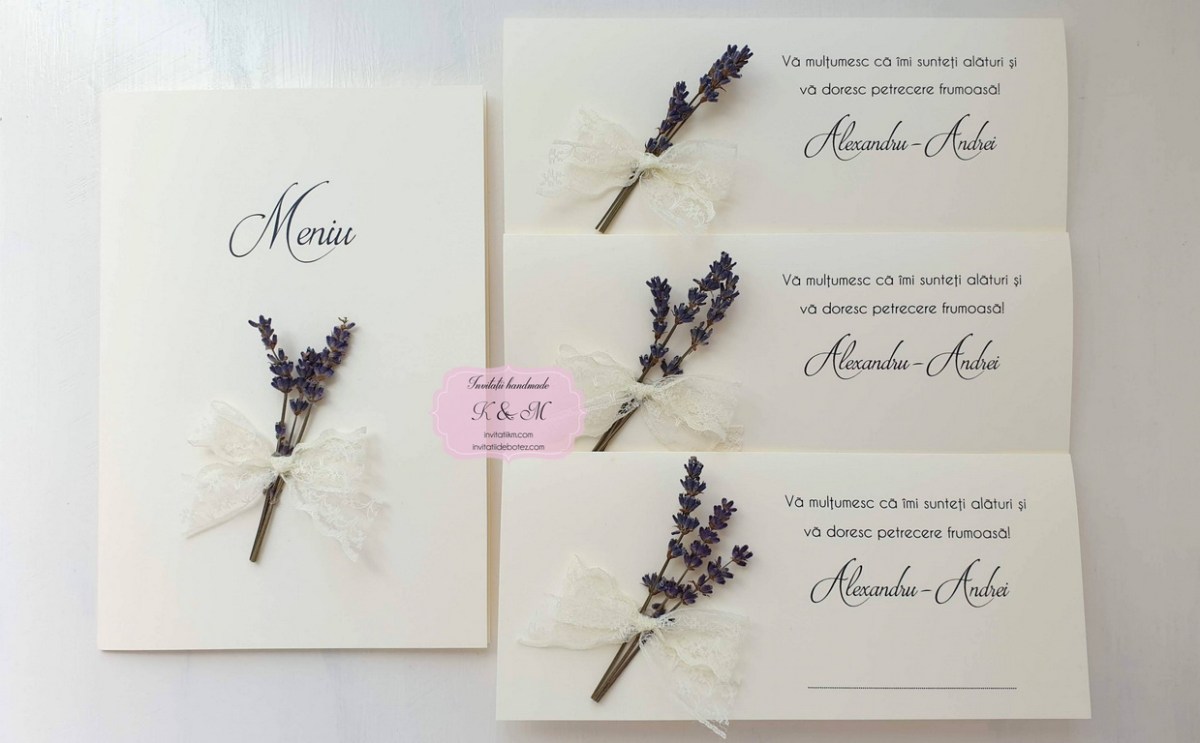 Meniu si plic de bani/card de asezare cu buchete de lavanda uscata si dantela