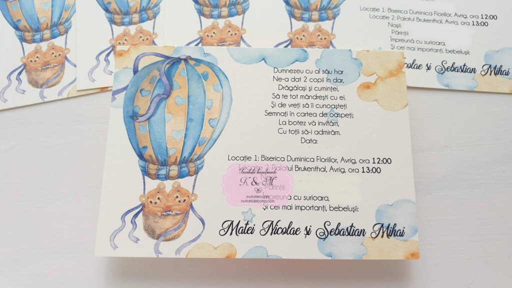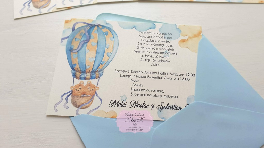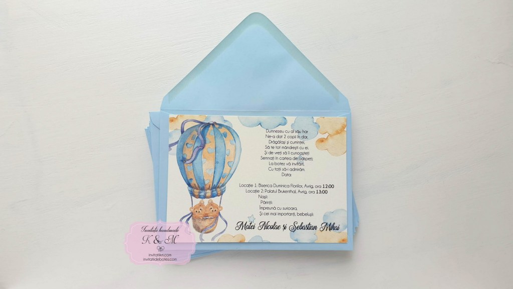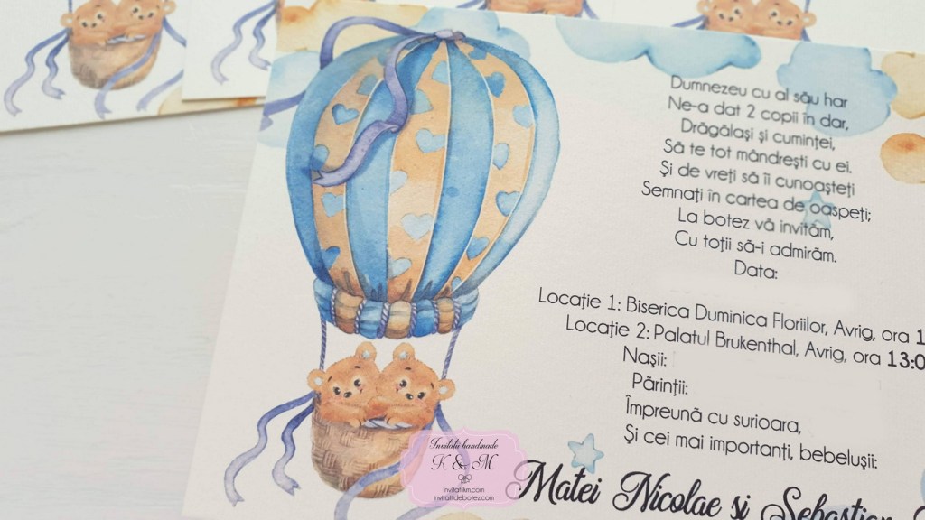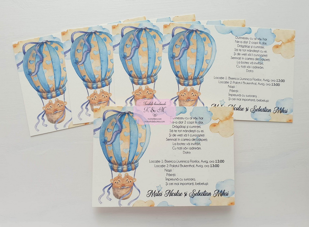 Invitatii de botez realizate din carton ivory texturat + plic bleu, cu ursuleti gemeni, balon cu aer cald si norisori