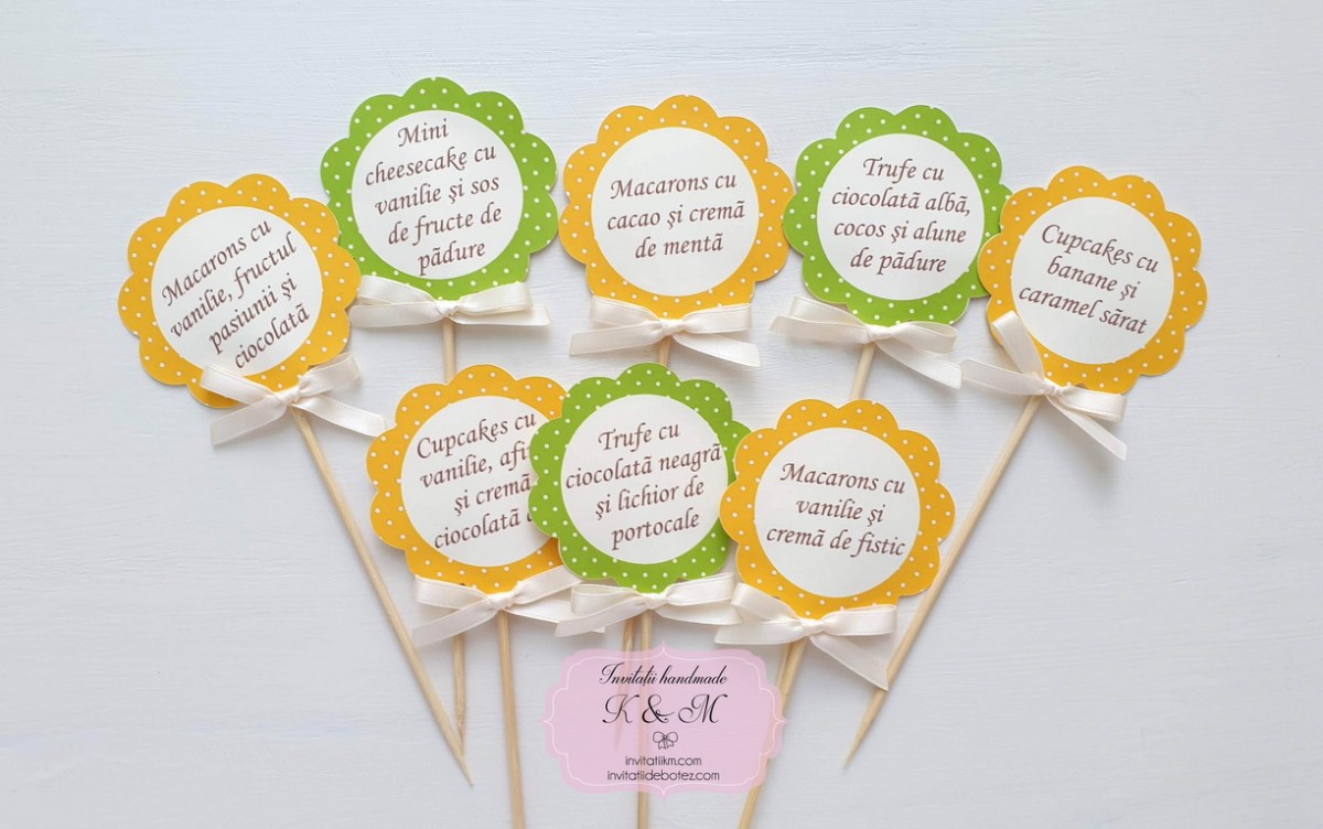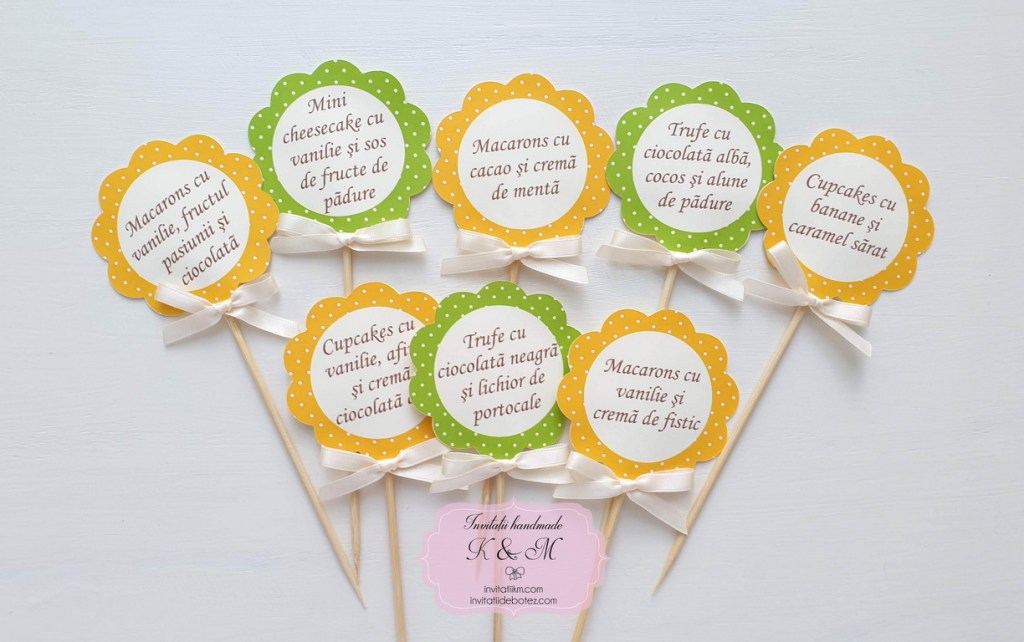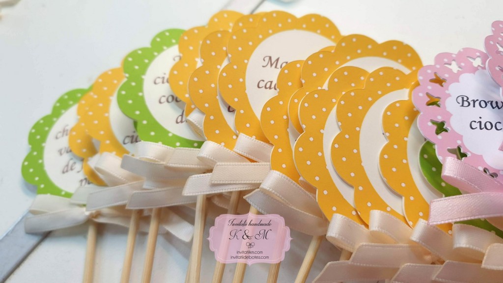 Mesaje medii pentru candy bar de botez cu fundite colorate. Mesajele pot avea denumirile prajiturilor sau mesaje standard (“Sunt dulce”, “Alege-ma pe mine” etc)