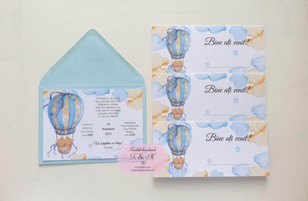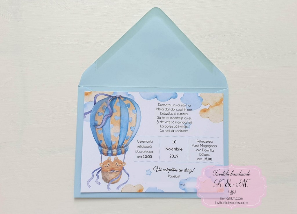 Invitatii de botez realizate din carton alb neted + plic bleu, cu ursuleti gemeni, balon cu aer cald si norisori; plicuri de bani asortate