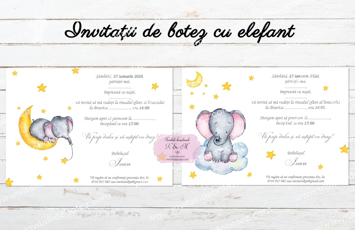 Invitatii de botez handmade cu elefant si stelute, pentru baietei