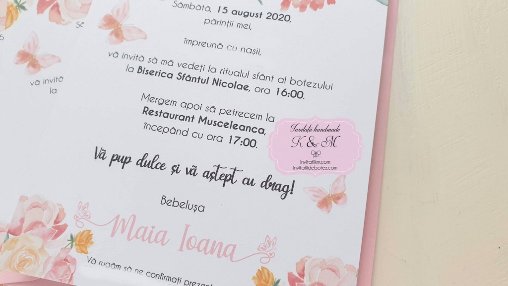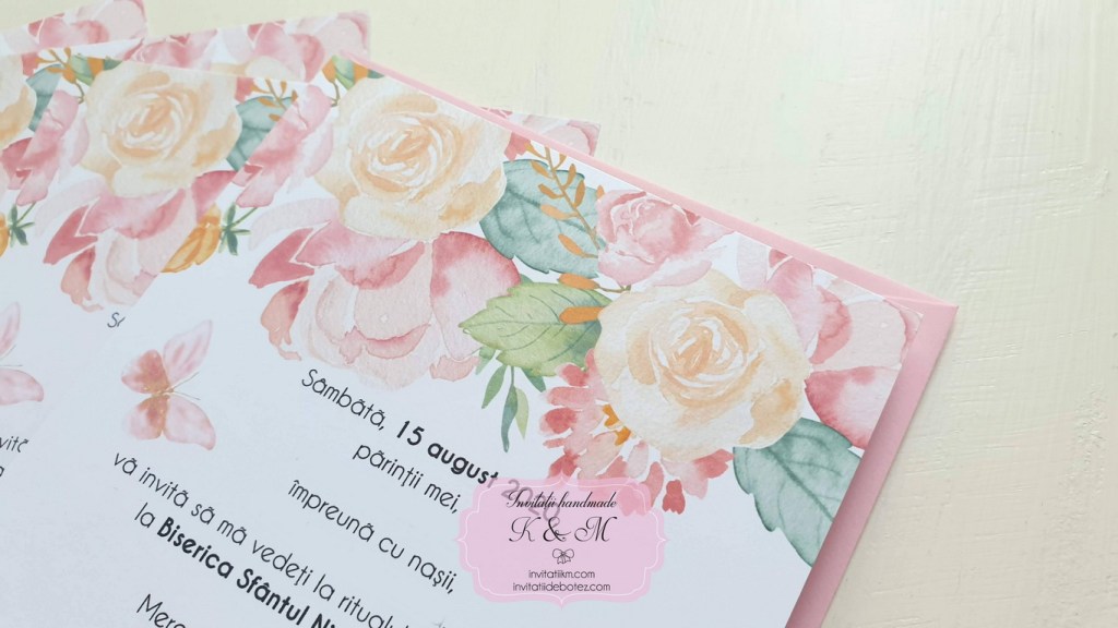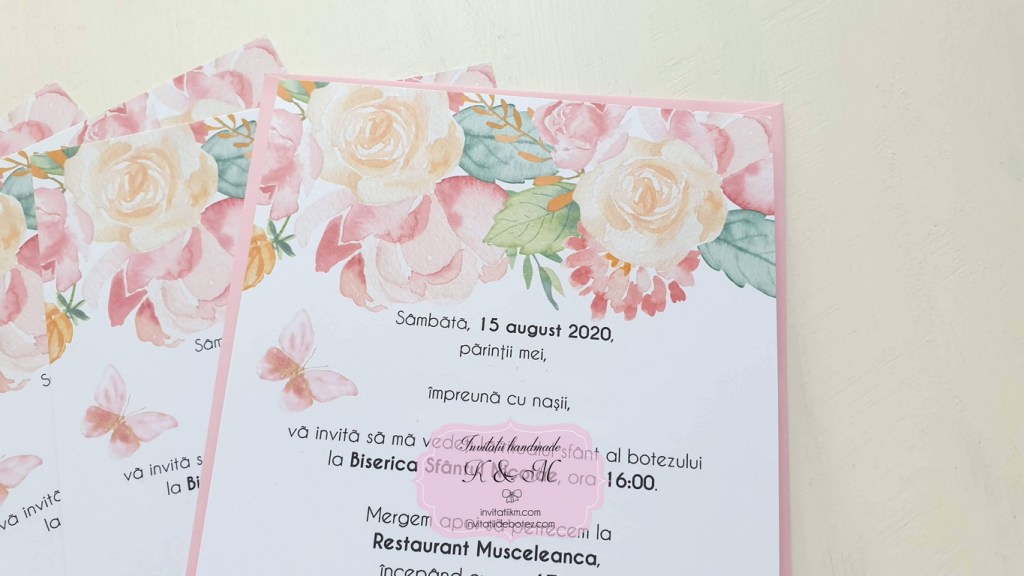 Invitatii de botez handmade cu fluturi roz si mint si flori