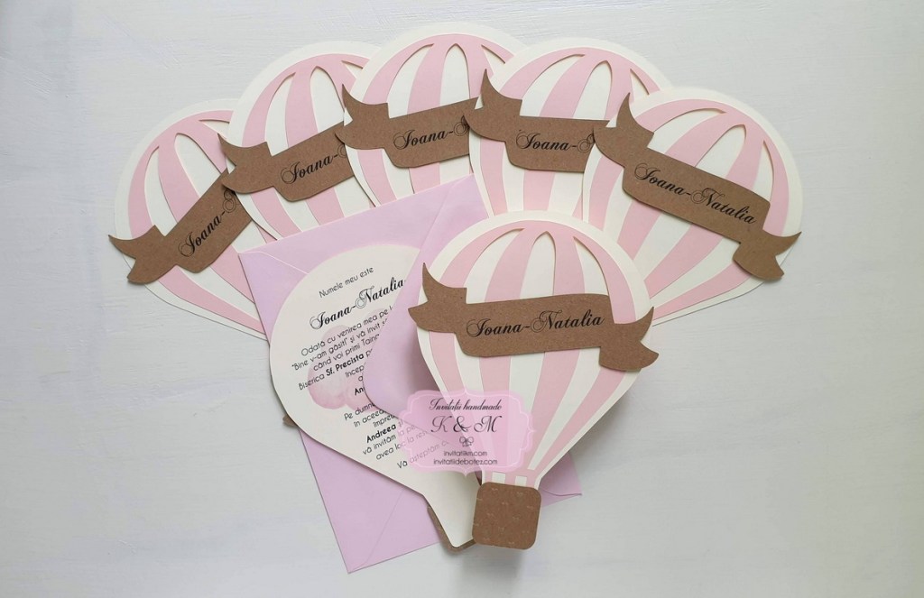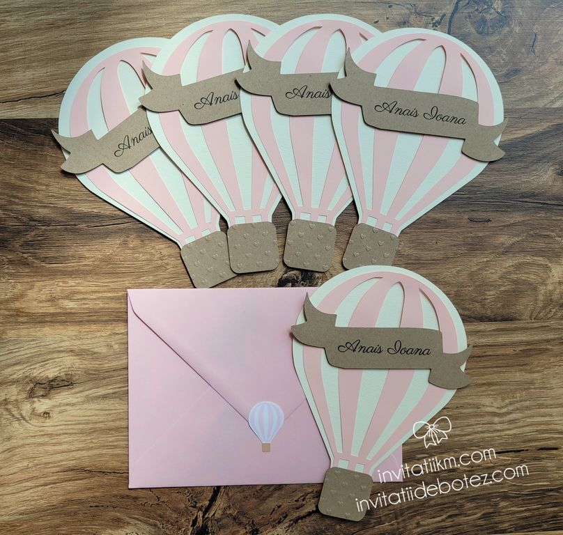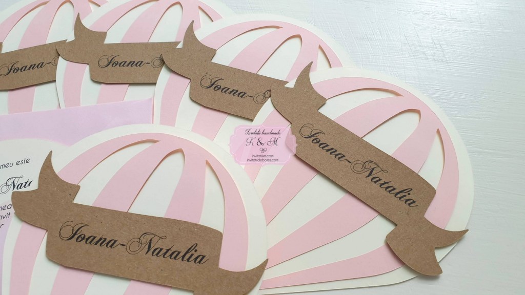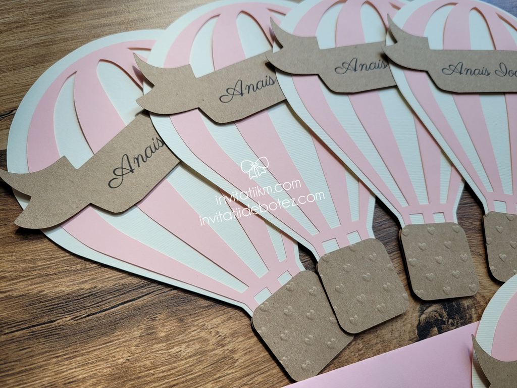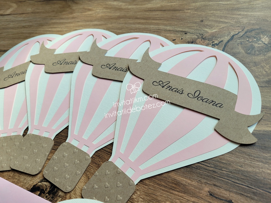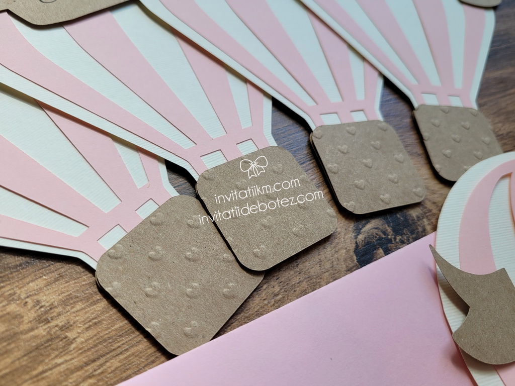 Invitatii de botez in forma de balon cu aer cald realizate din cartoane decupate suprapuse (ivory, roz si natur)