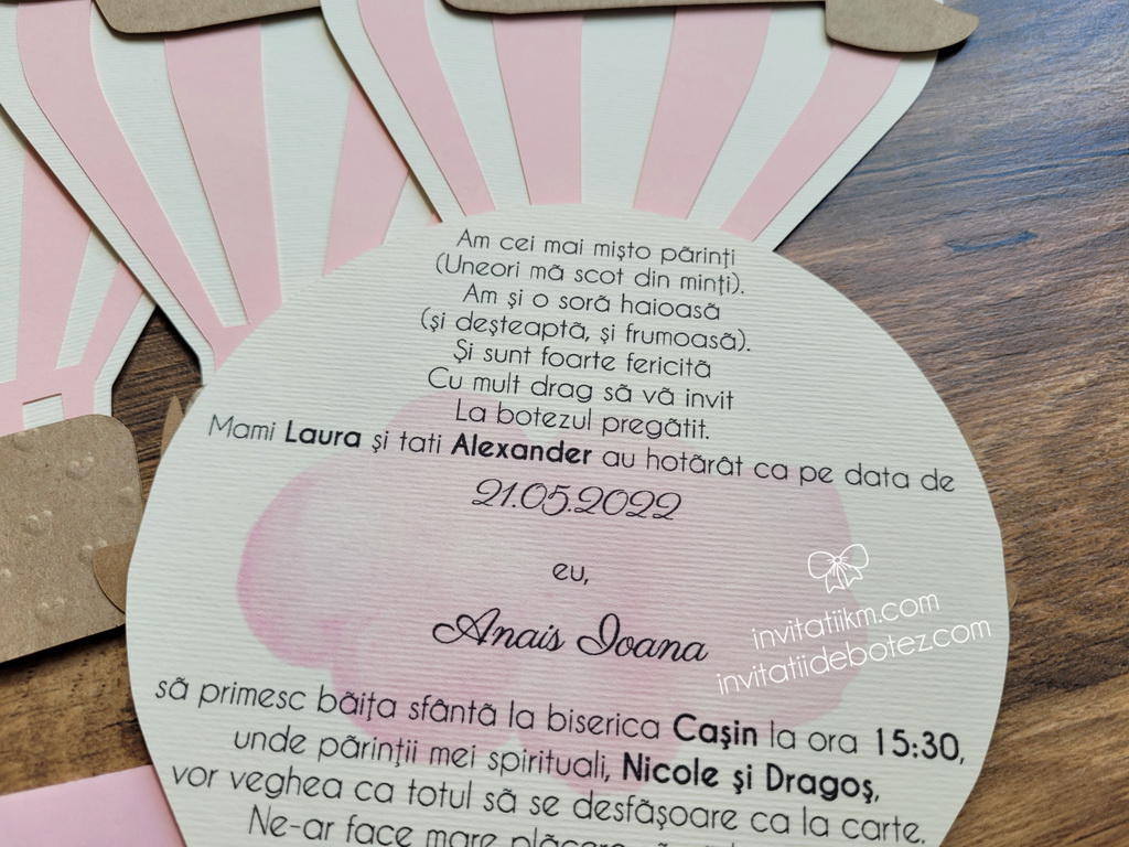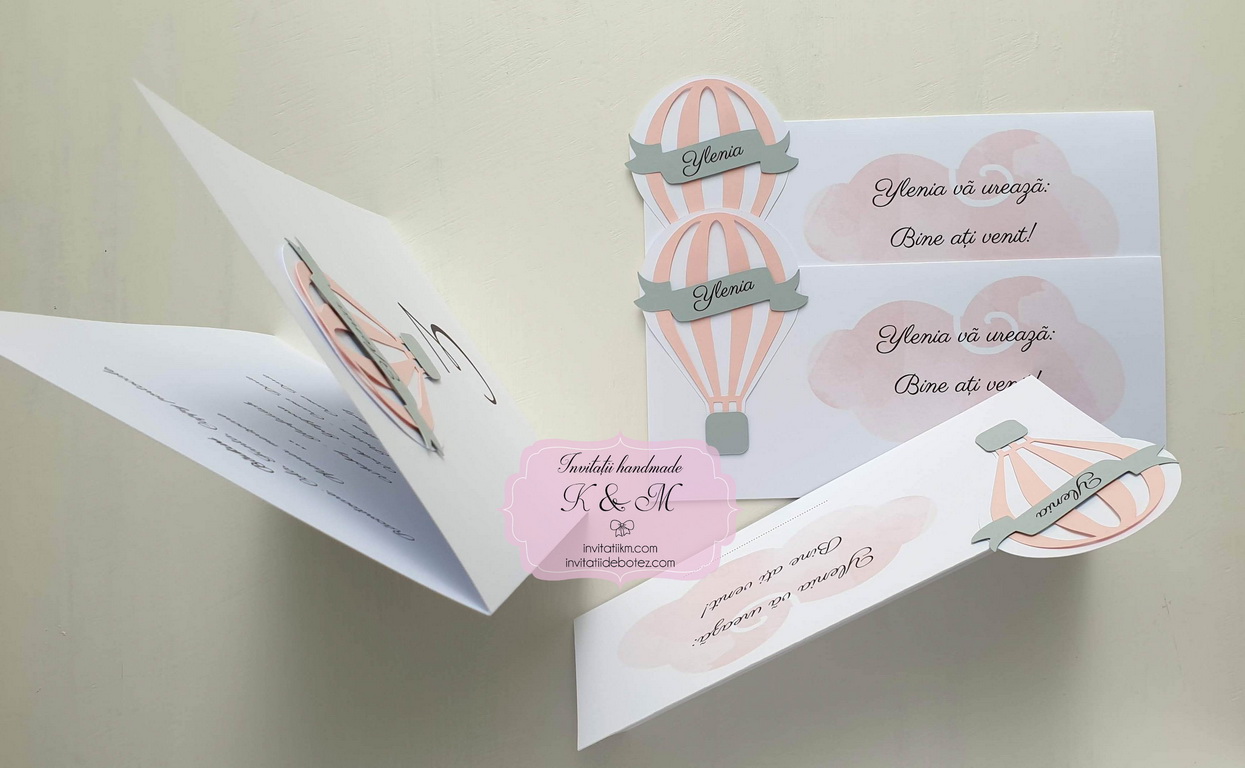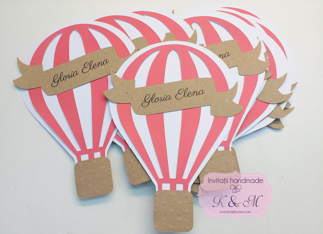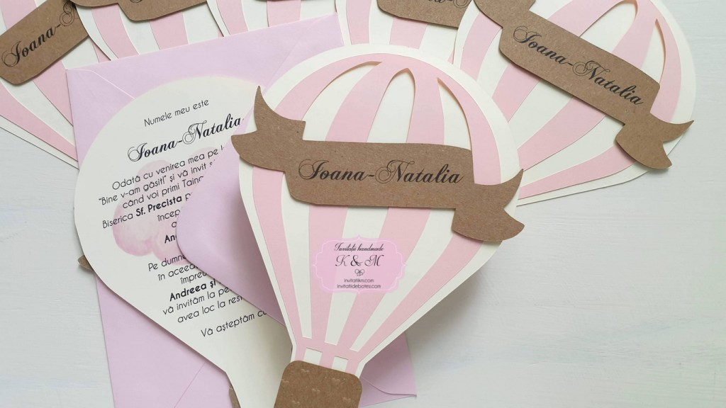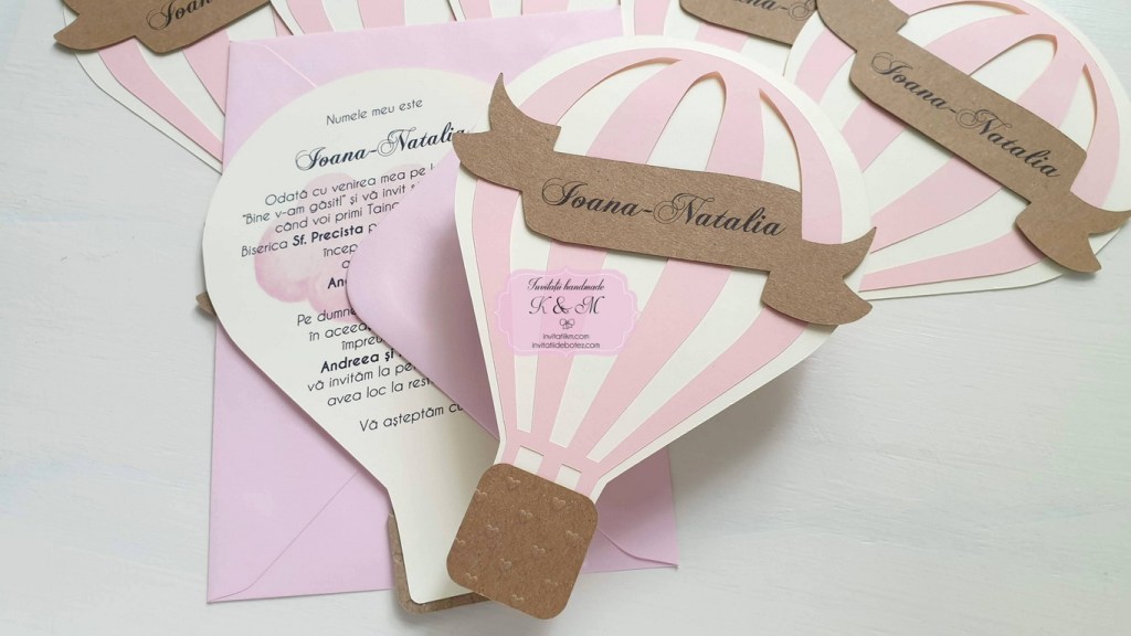Invitatii de botez in forma de balon cu aer cald realizate din cartoane decupate suprapuse (ivory, roz si natur)