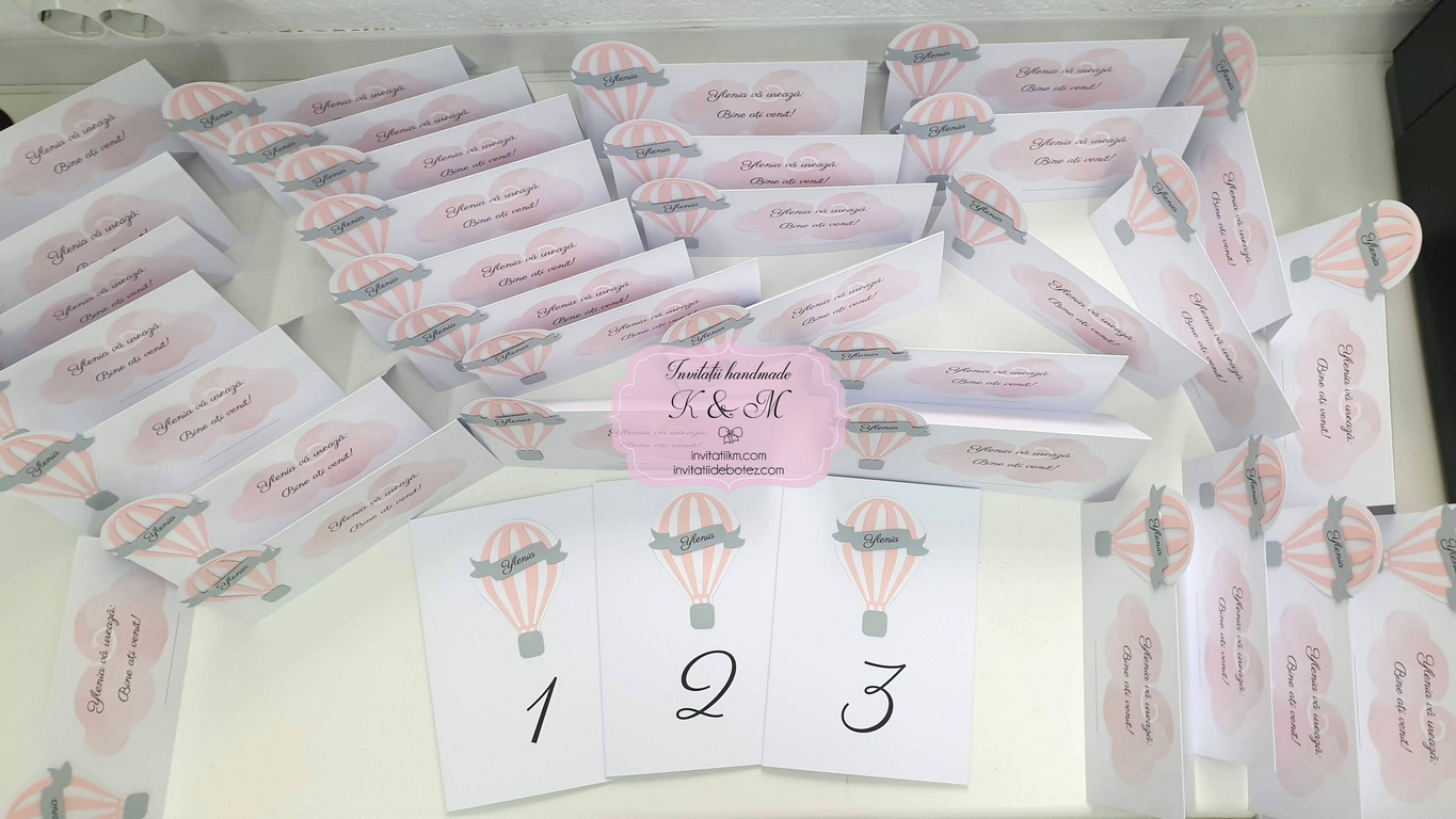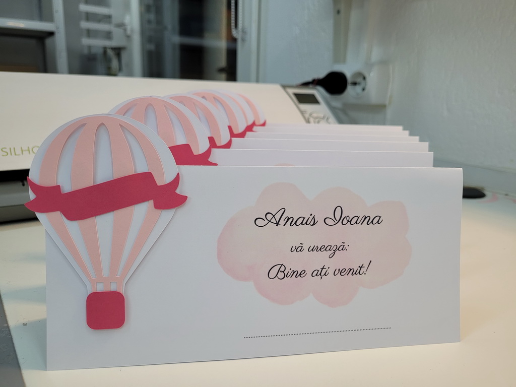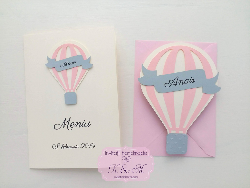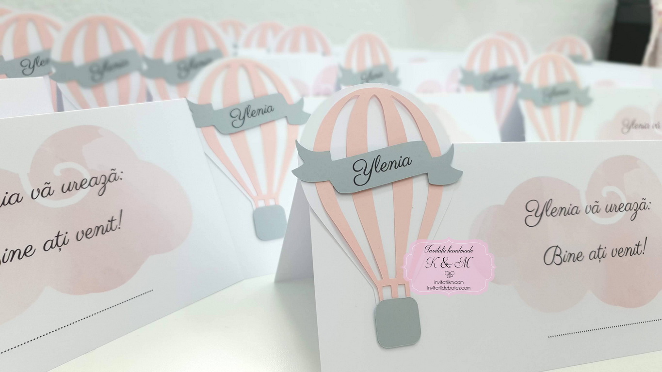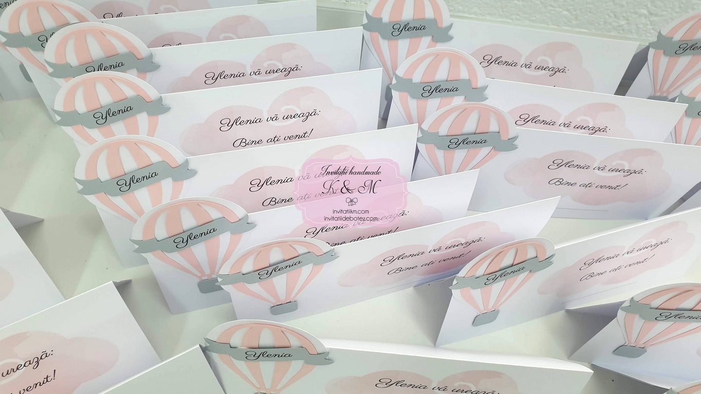 Invitatii de botez in forma de balon cu aer cald realizate din cartoane decupate suprapuse (ivory, roz si natur)