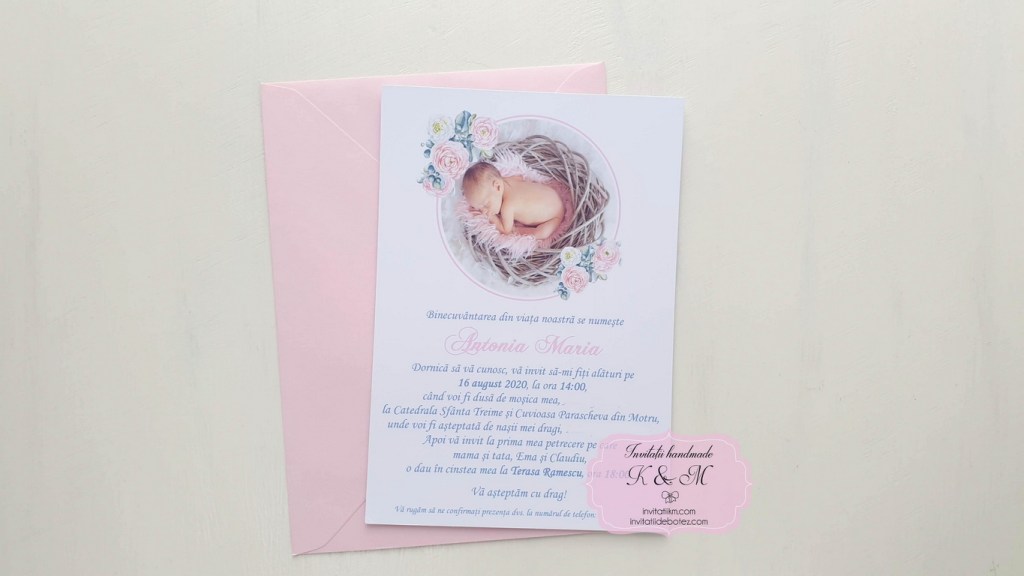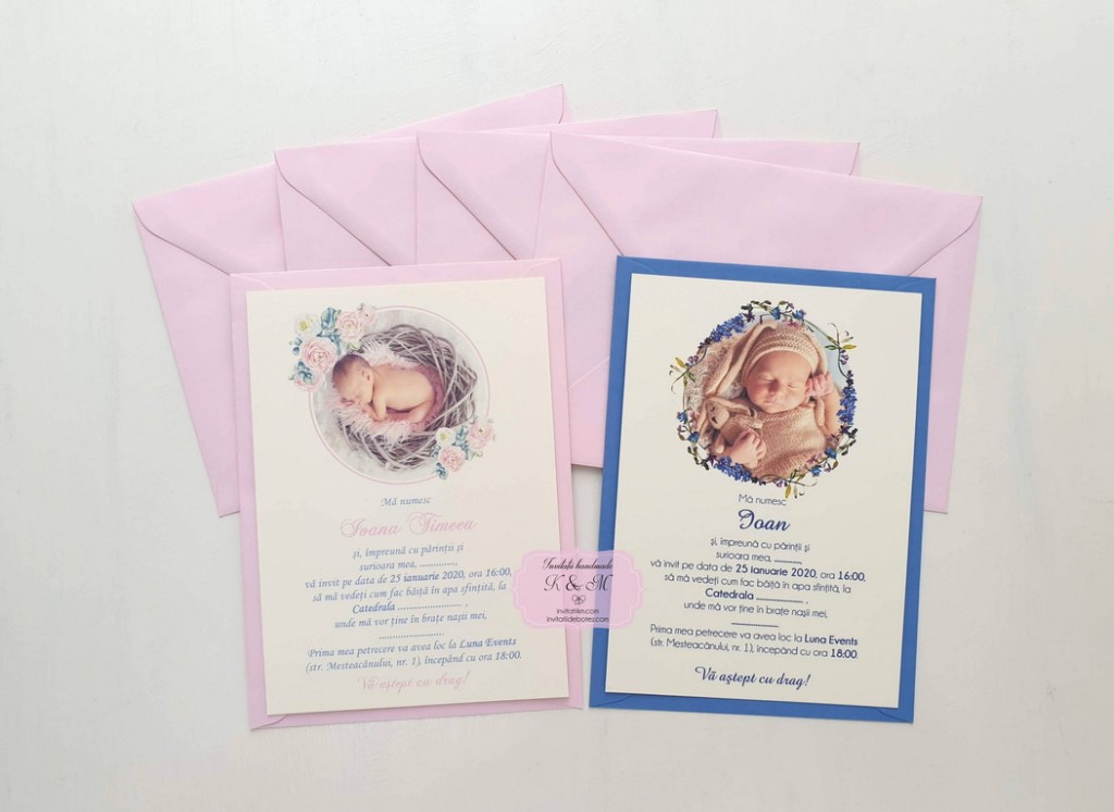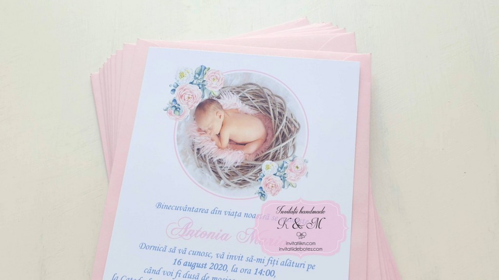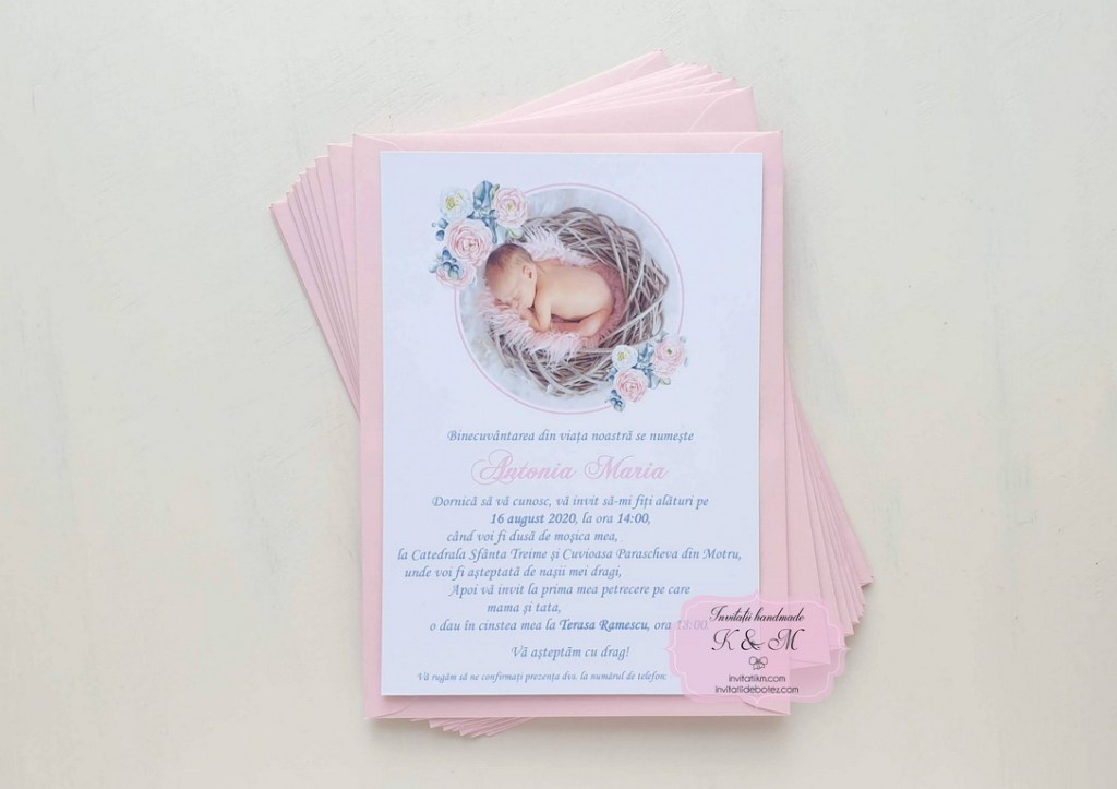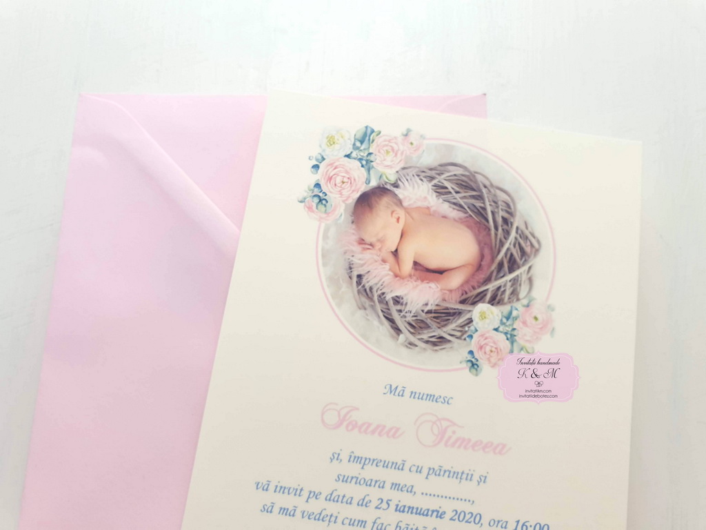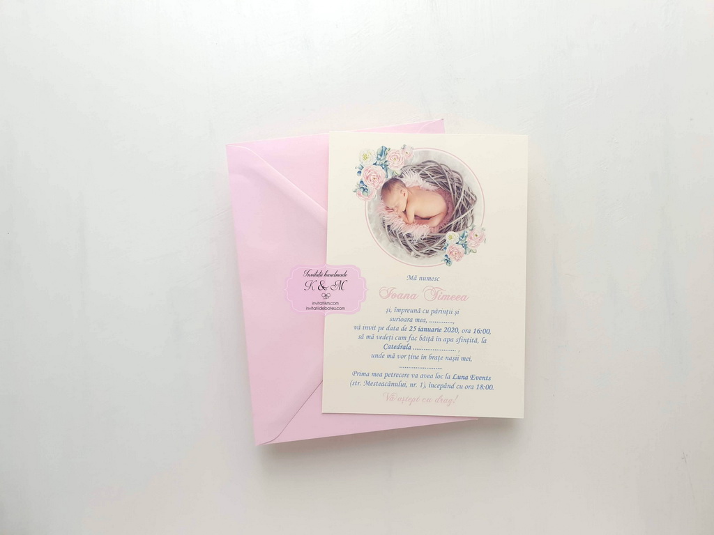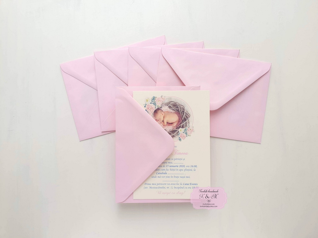 Invitatii de botez realizate din carton gros cu coronita florala, poza bebelusului (este necesara o poza de calitate foarte buna, luminoasa) si plic asortat