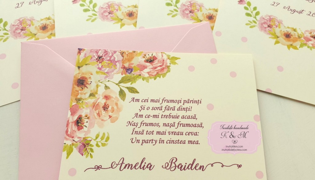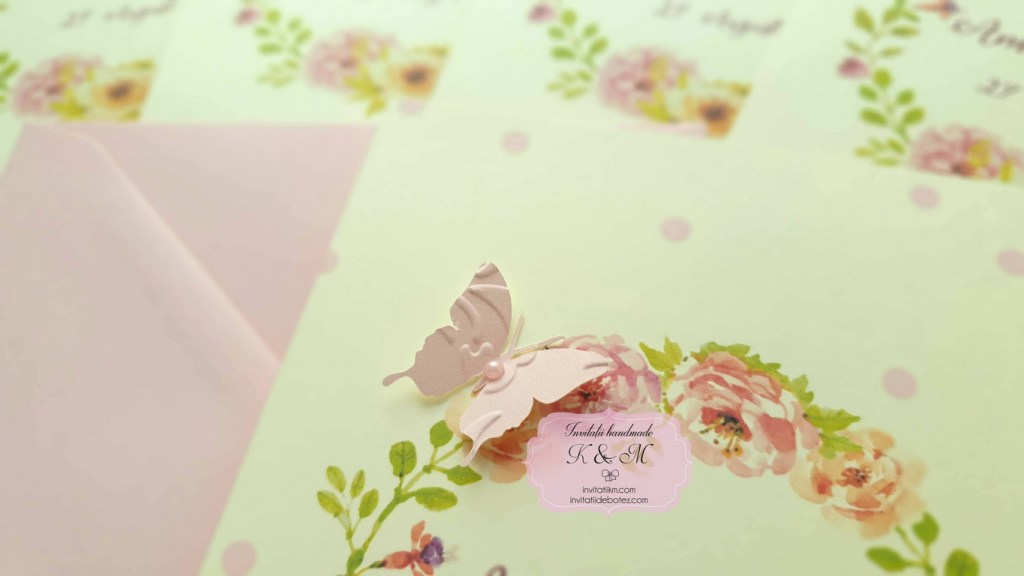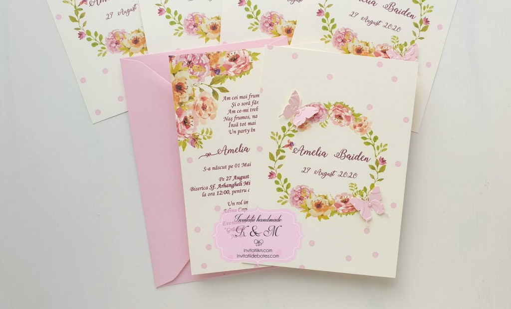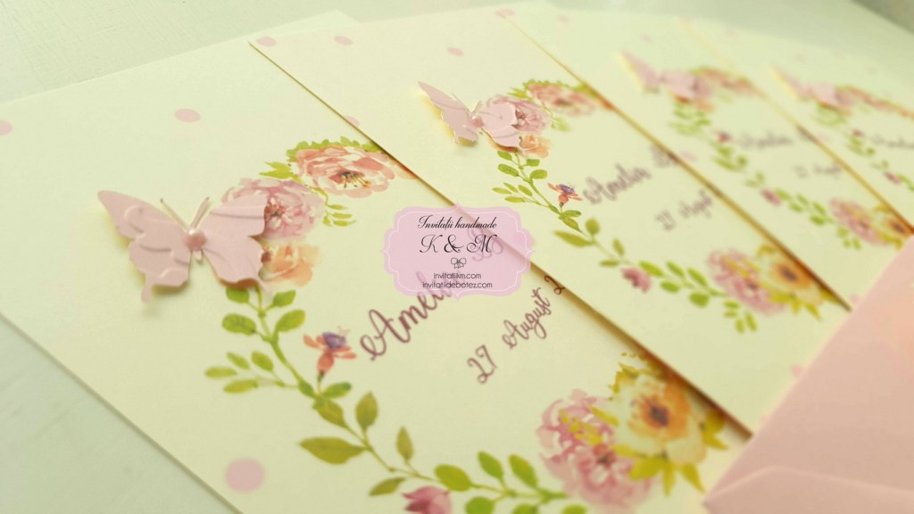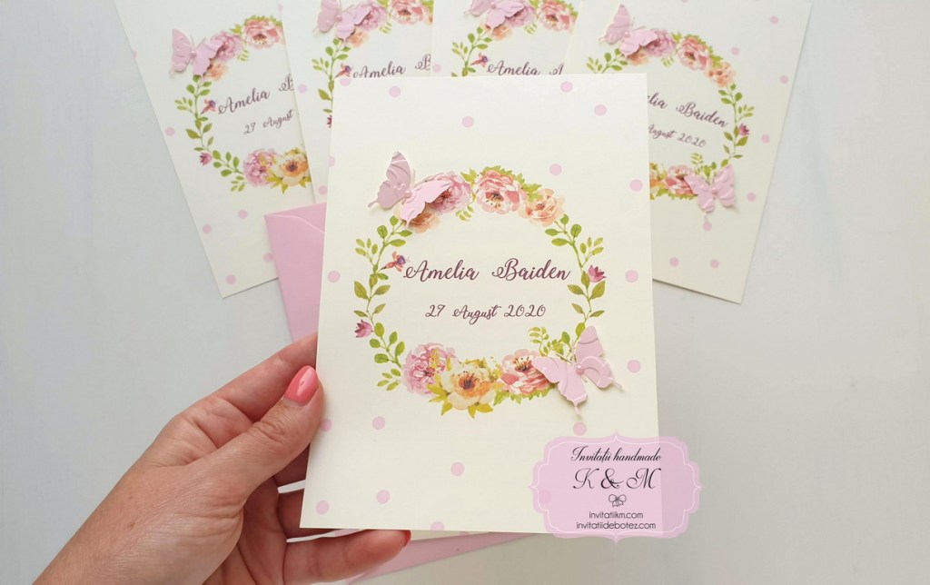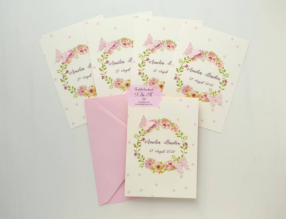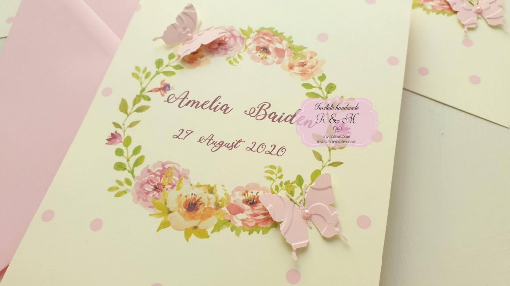 Invitatie de botez realizata din carton gros ivory cu text, print fata-verso, accesorizata cu doi fluturasi roz embosati si perle roz.