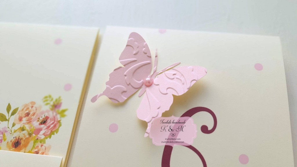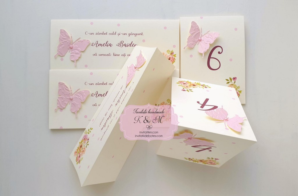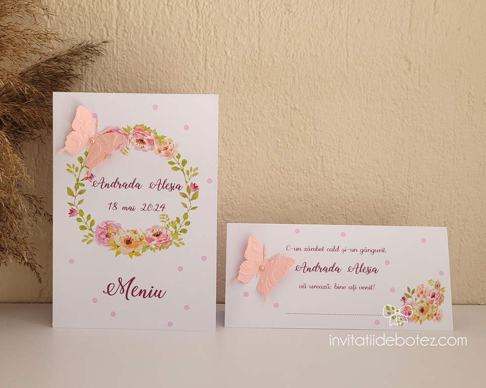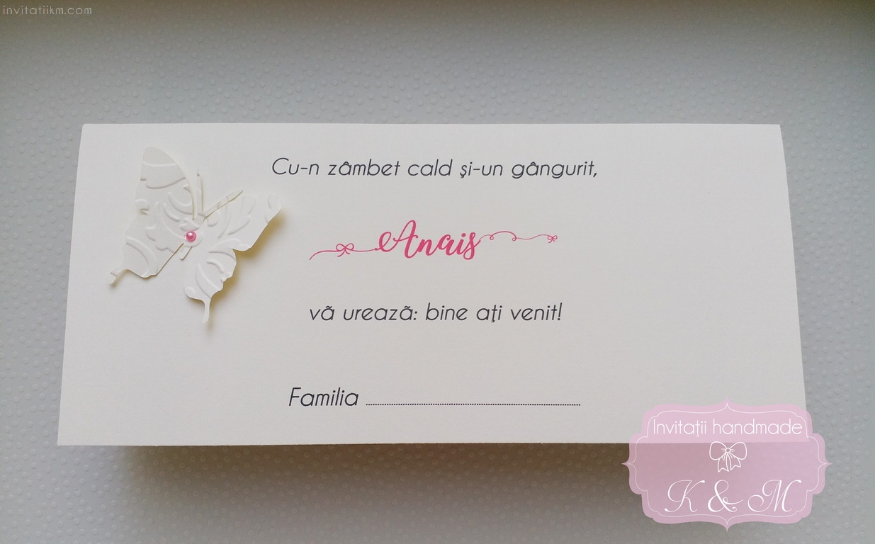 Meniuri, numere masa, plicuri bani realizate din carton alb/ivory accesorizate cu un fluturas roz embosat si perla