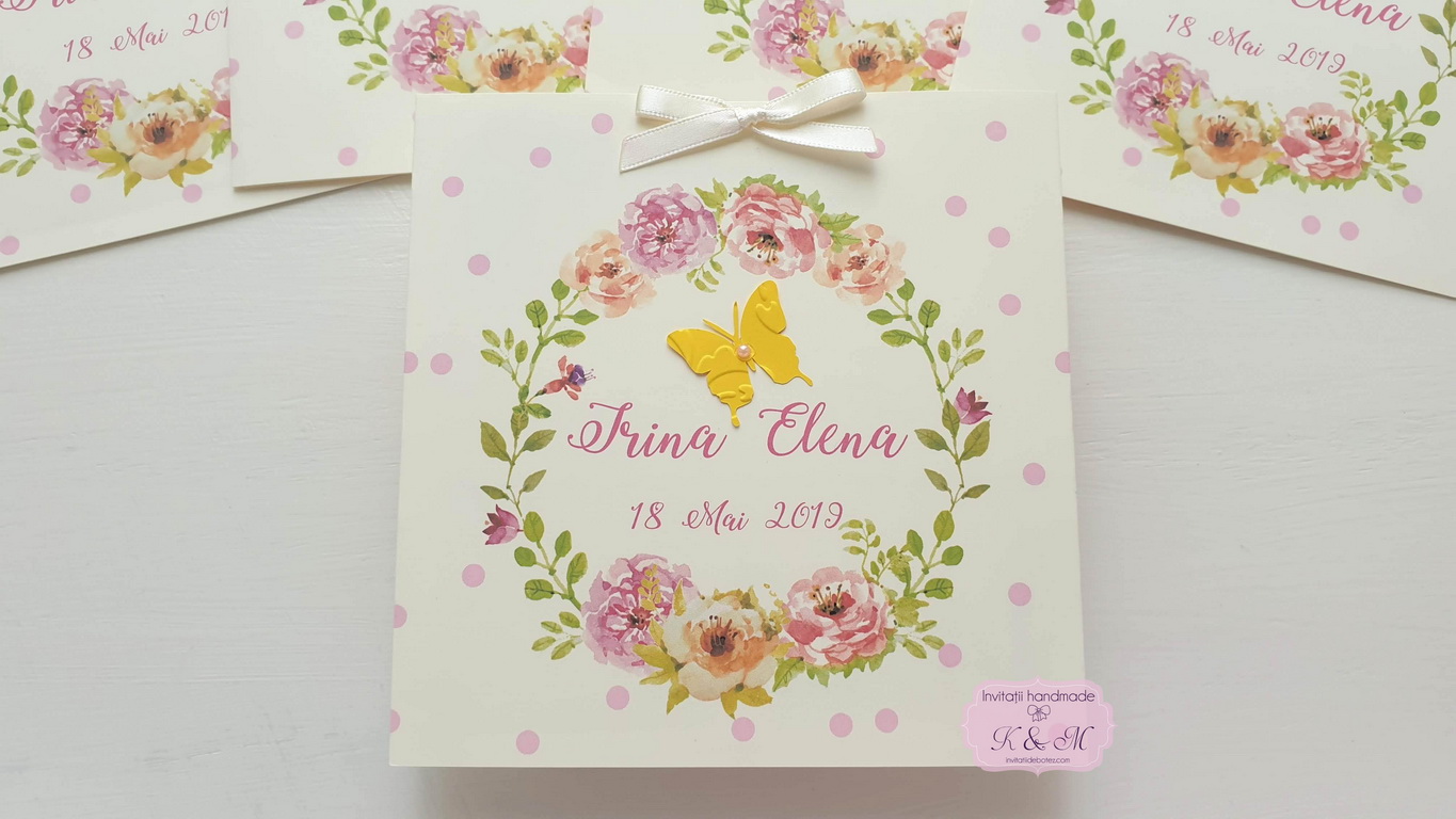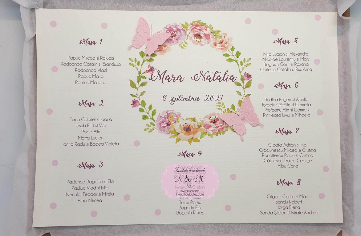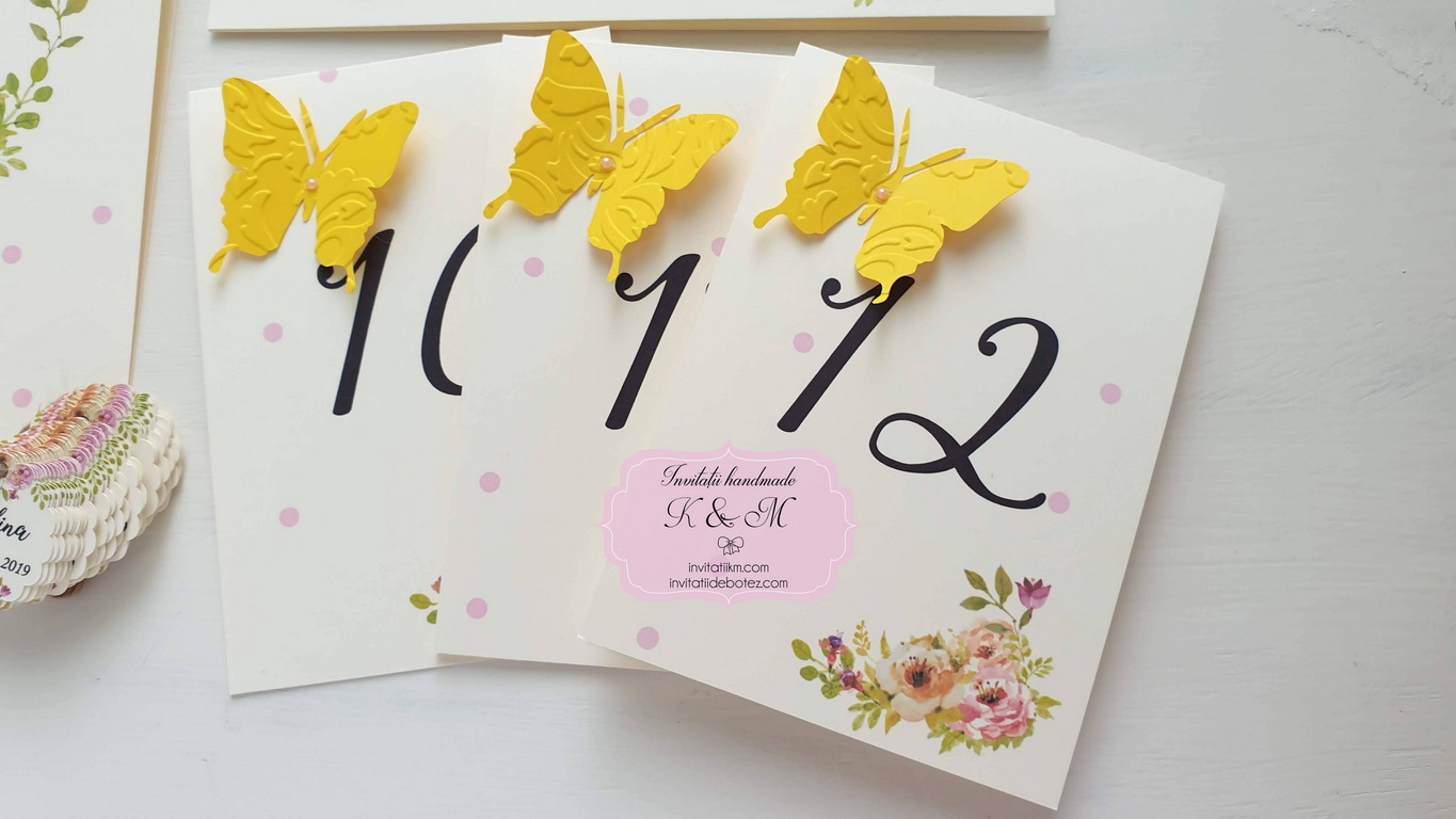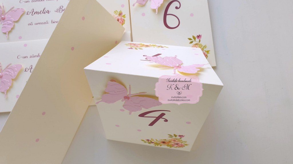 Meniuri, numere masa, plicuri bani realizate din carton alb/ivory accesorizate cu un fluturas roz embosat si perla
