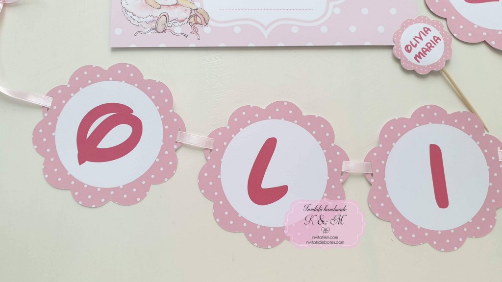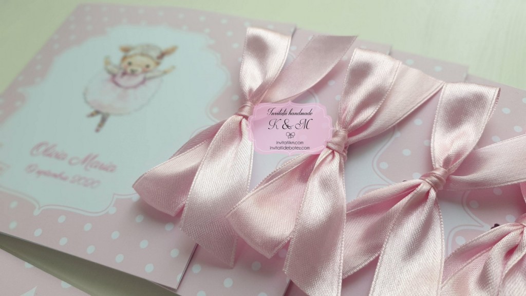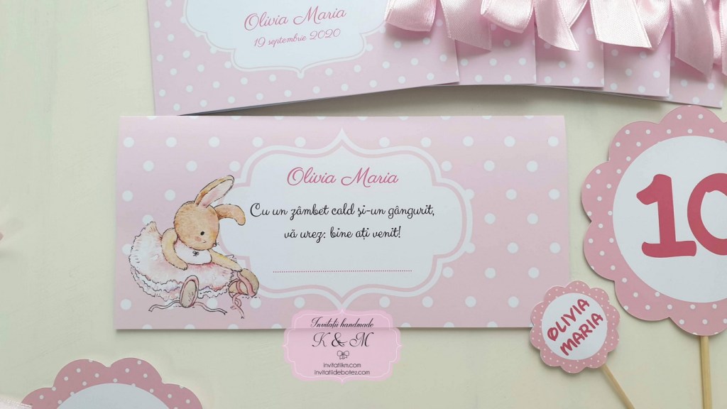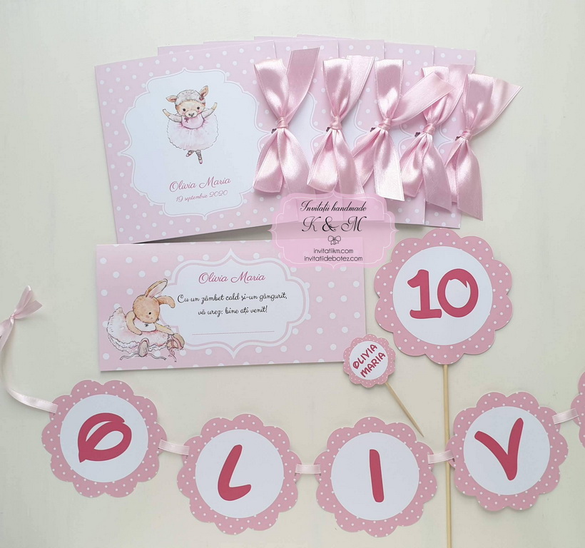 Invitatie de botez cu oita balerina realizata din carton alb neted, legata cu panglica satinata. Nu are si nu necesita plic. Plicuri de bani cu iepuras balerina, numere de masa, mesaje si ghirlanda candy bar asortate