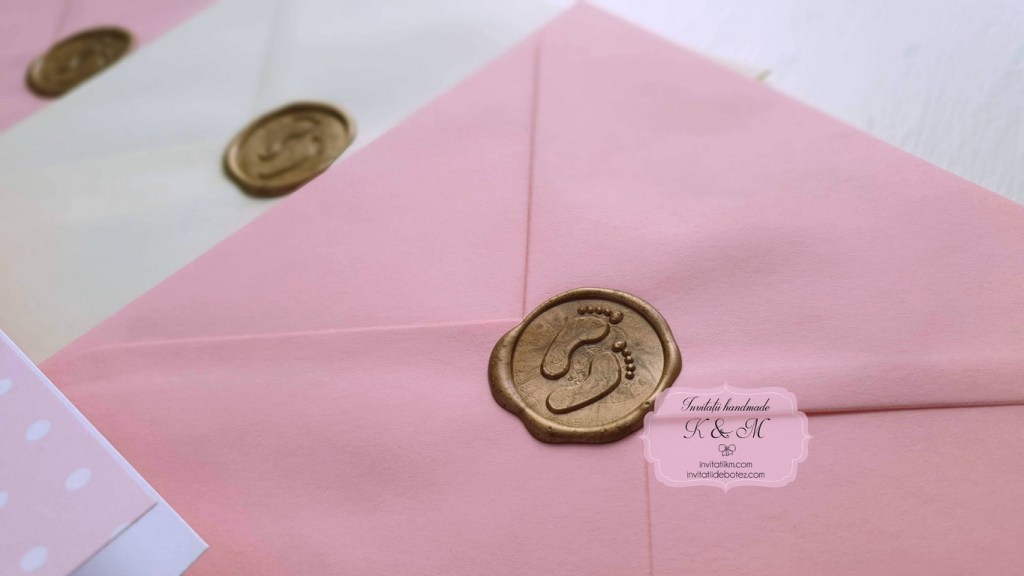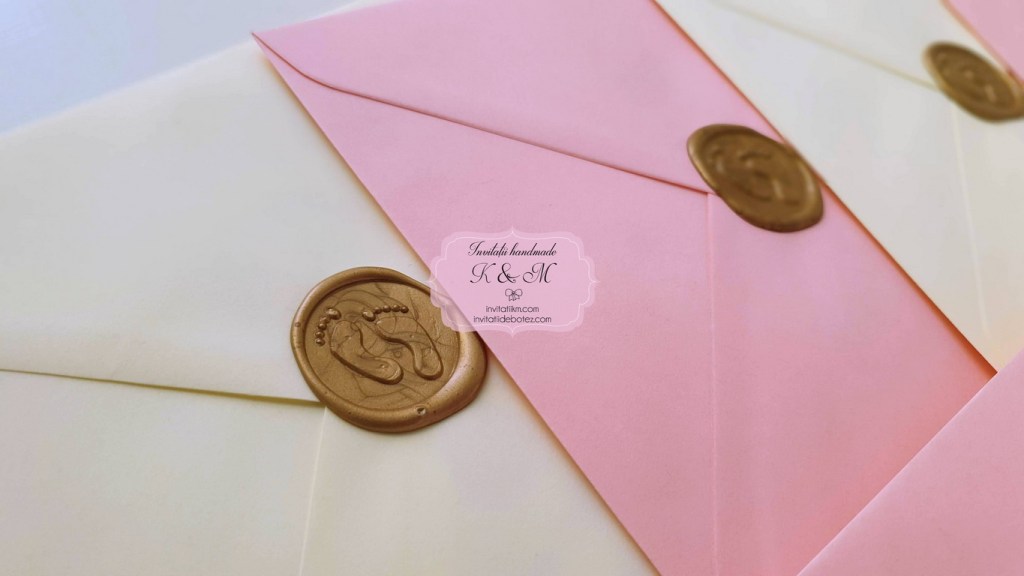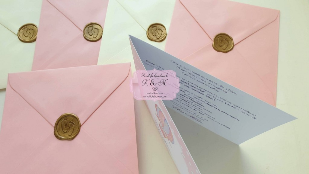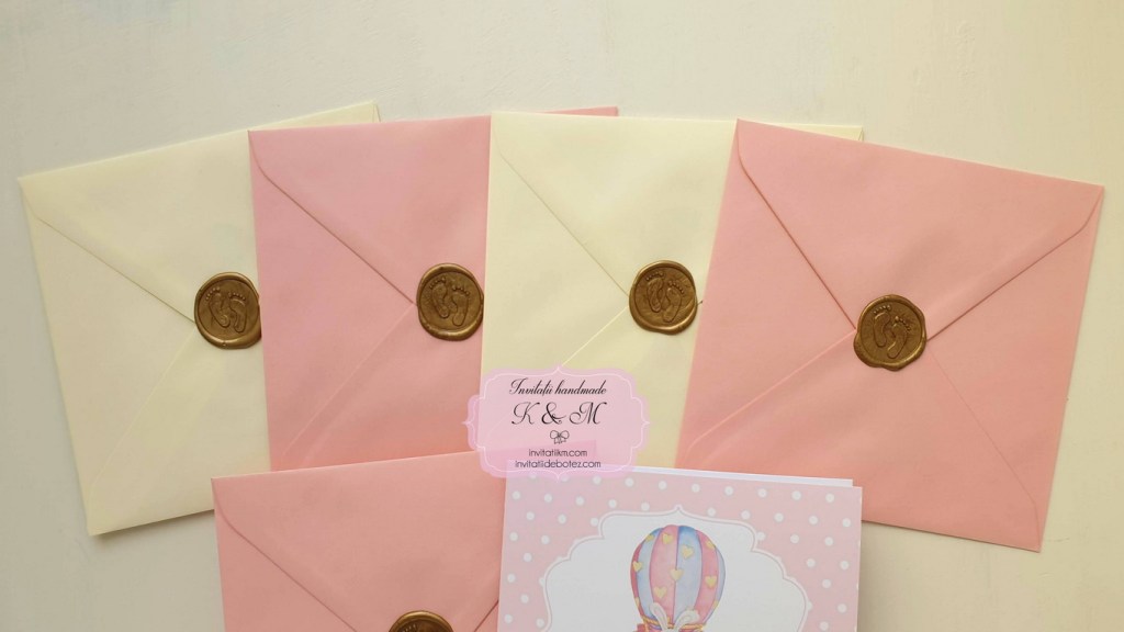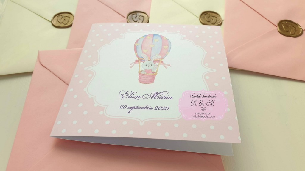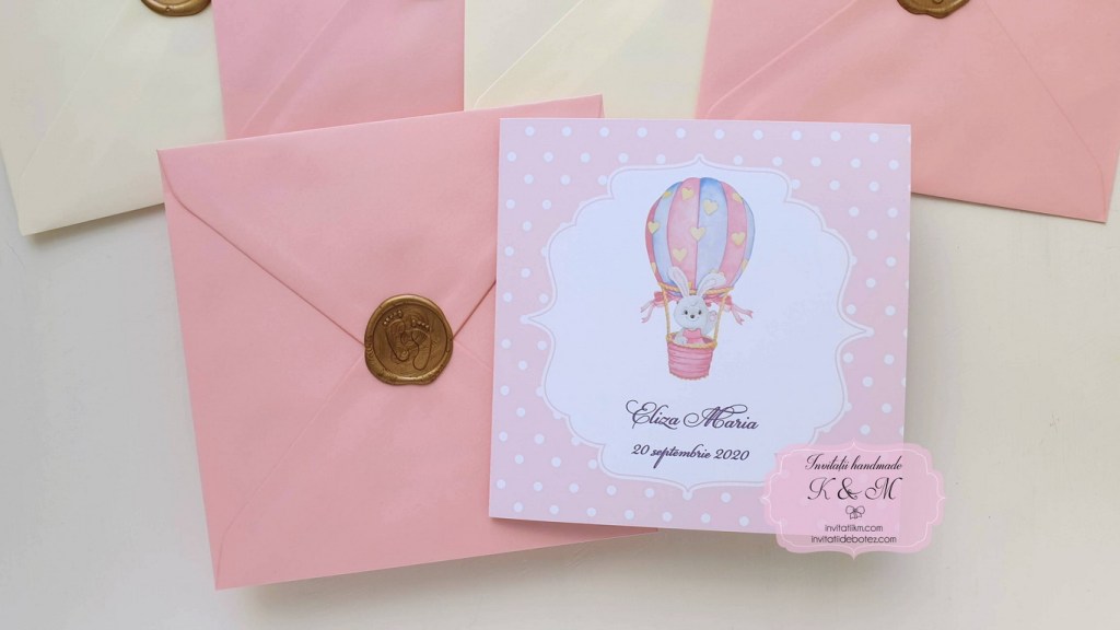 Invitatii de nunta realizate din carton gros alb neted, iepuras simpatic intr-un balon cu aer cald si plicuri asortate, inchise cu sigiliu din ceara, cu talpi de bebelus in relief