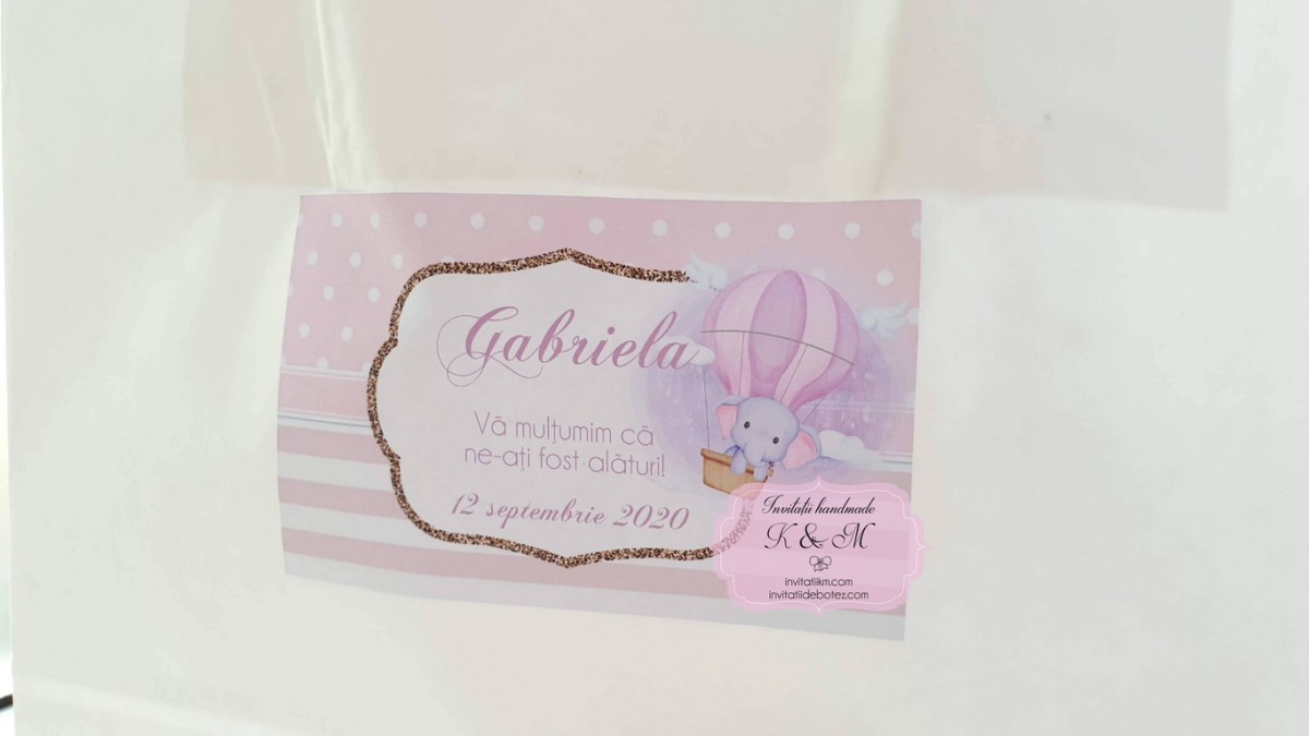 Etichete realizate din carton alb autocolant mat cu elefant simpatic in balon cu aer cald, chenar auriu printat si fundal roz pal