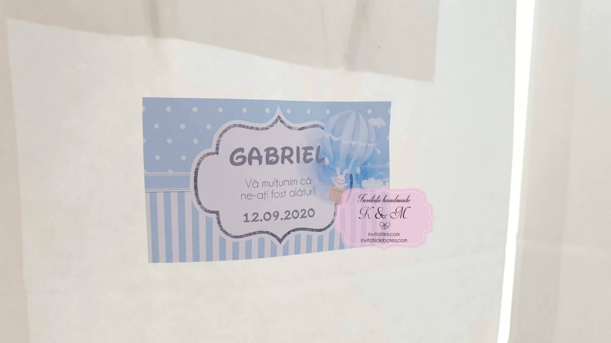 Etichete realizate din carton alb autocolant mat cu iepuras simpatic in balon cu aer cald, chenar argintiu printat si fundal bleu