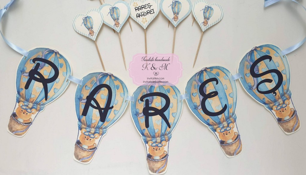 Mesaje/propsuri mici pentru candy bar si litere ghirlanda pentru botez tematic cu ursulet in balon cu aer cald