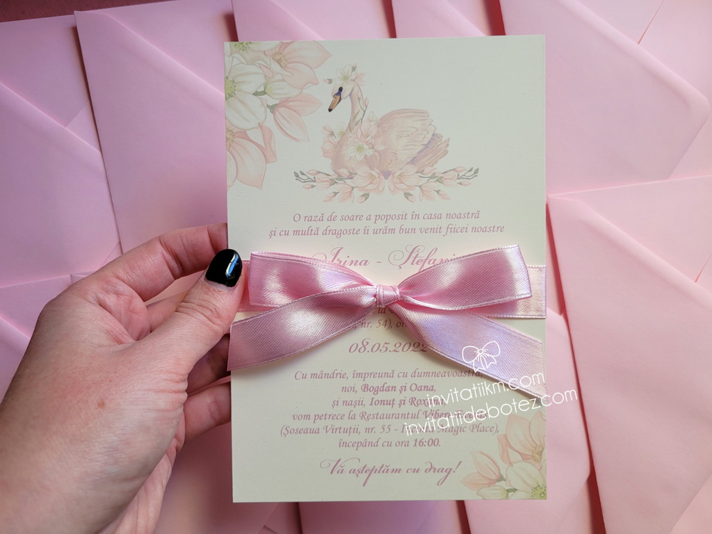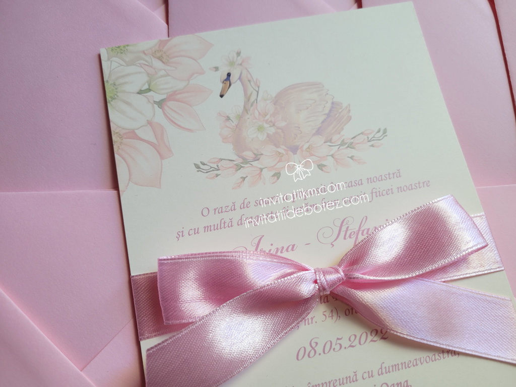 Invitatii de botez cu lebede si flori