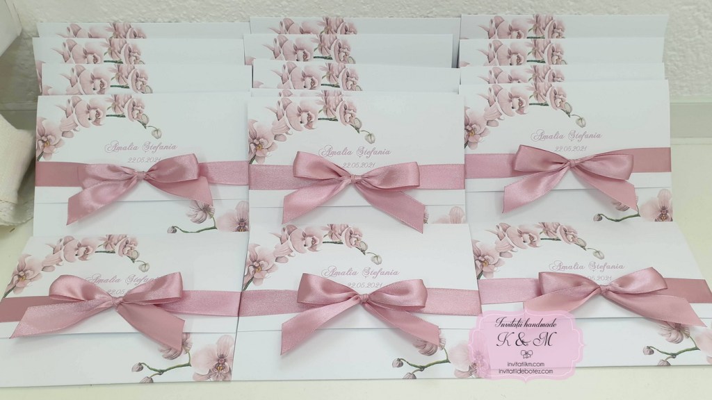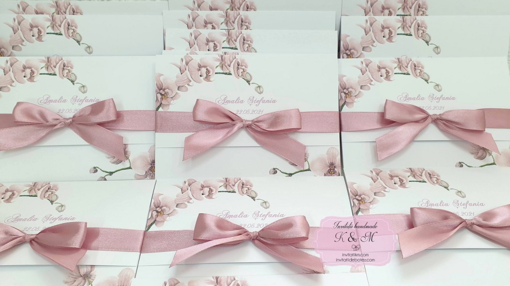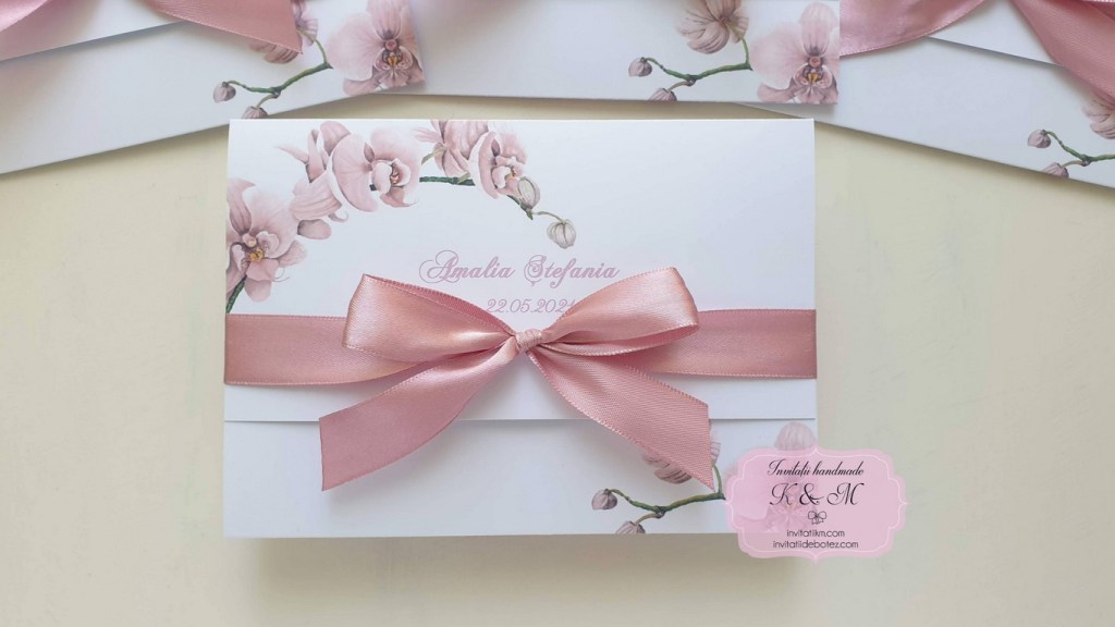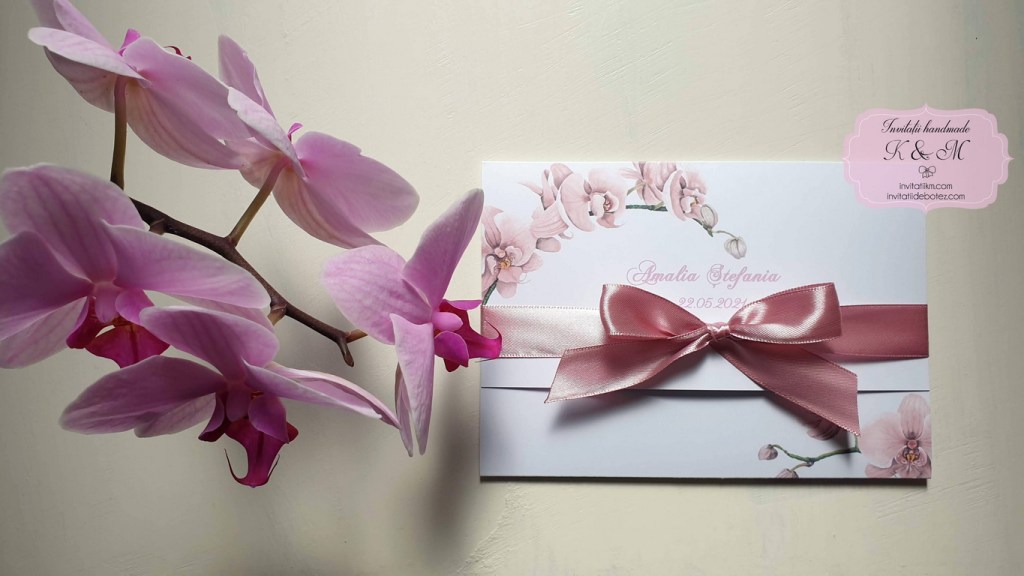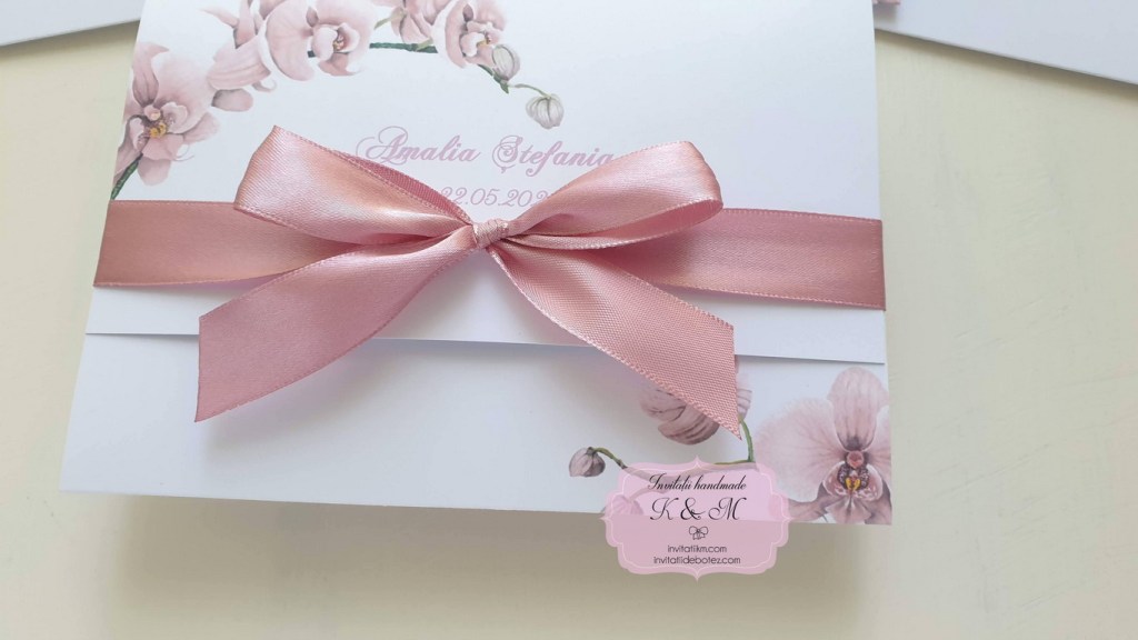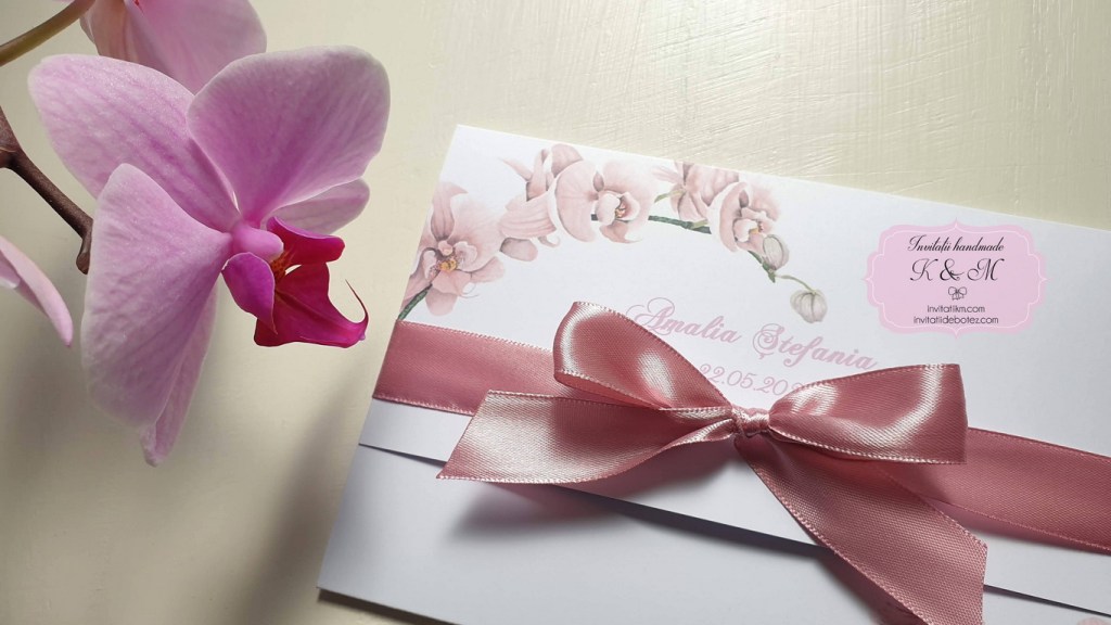 Invitatie de botez handmade realizata din carton pliat in 3 parti, cu orhidee roz vintage, legata cu o fundita eleganta din satin. Pe spate are un spatiu unde poate fi trecut destinatarul. Nu are nevoie de plic. Florile/culorile se pot modifica.