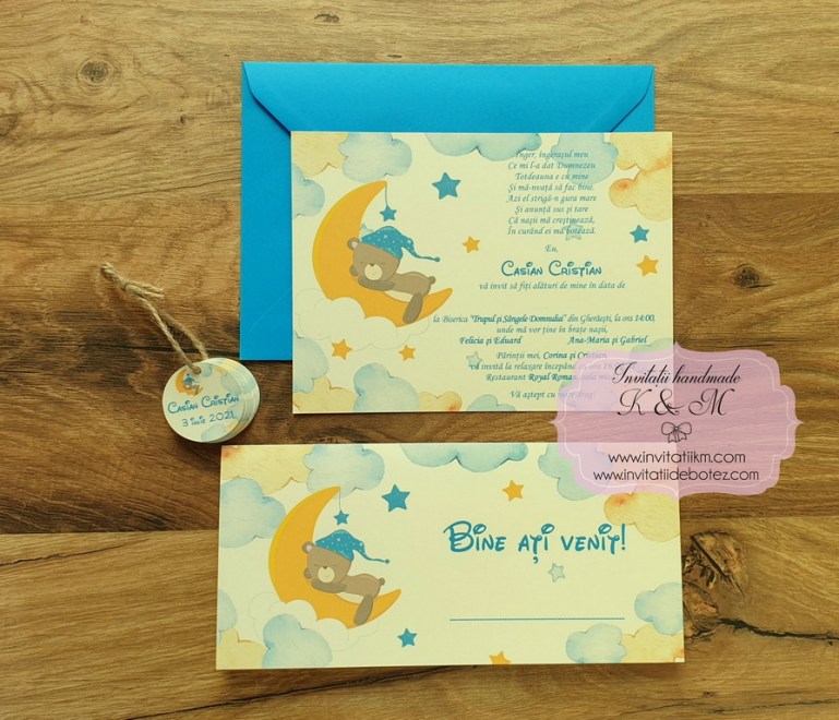 Etichete pentru marturii de botez, rotunde, cu ursulet, luna si stelute