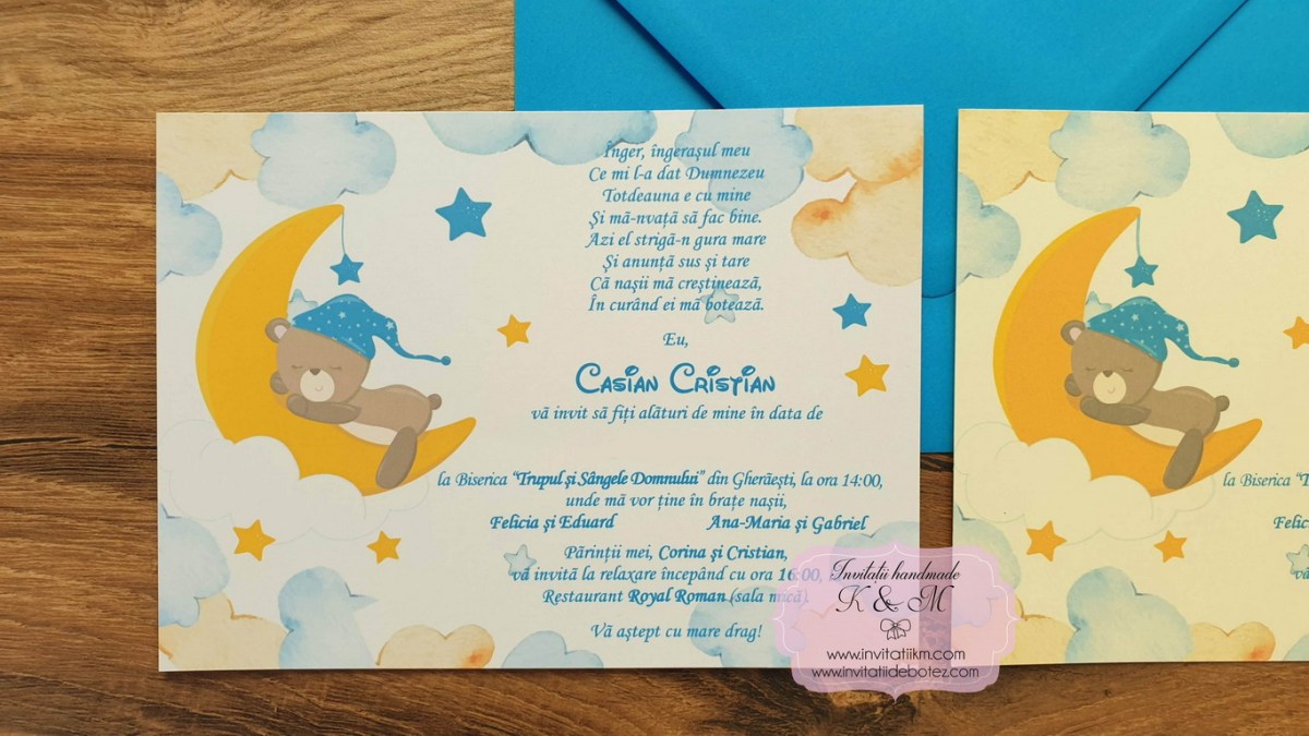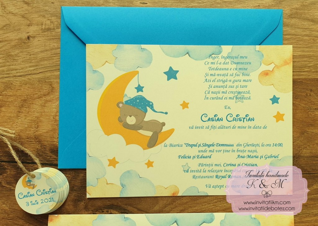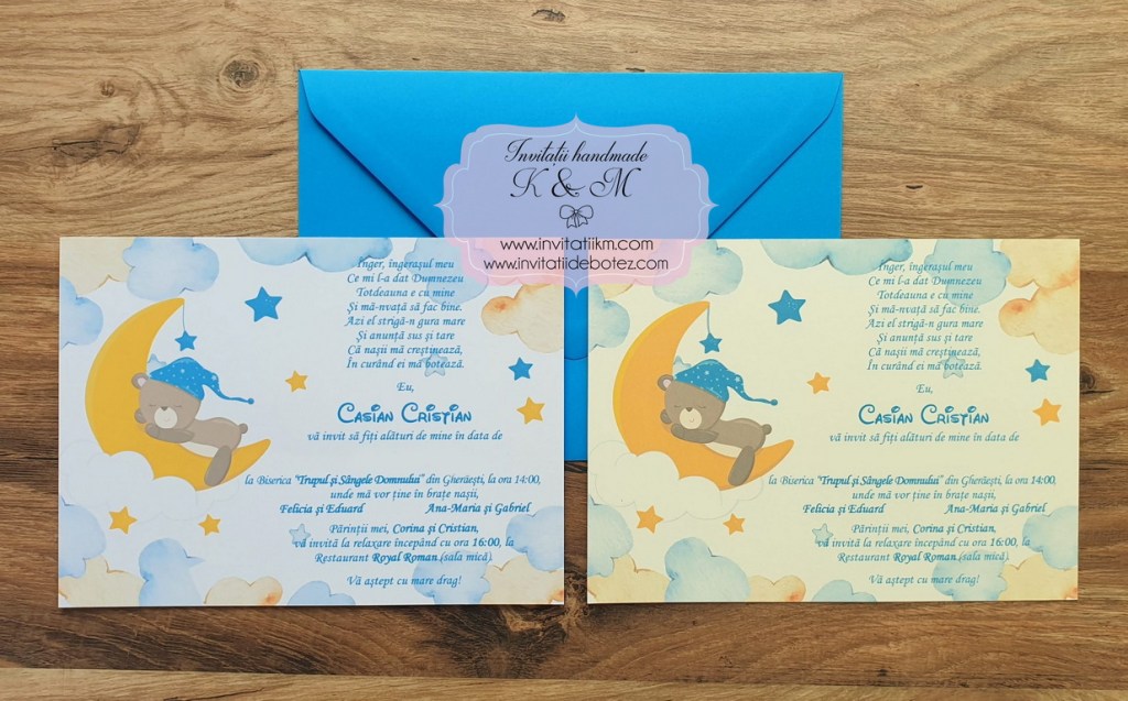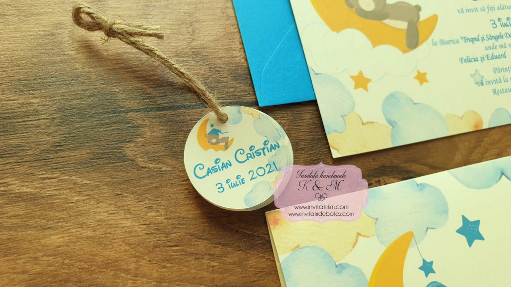Invitatii de botez handmade cu ursuleti, luna si stelute