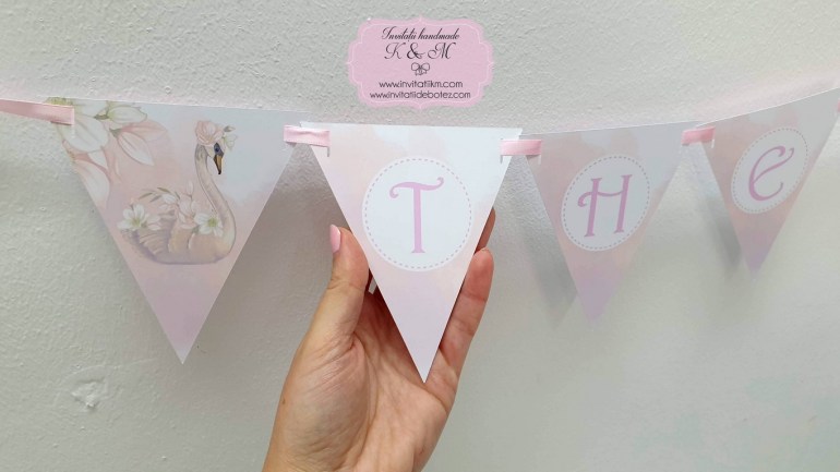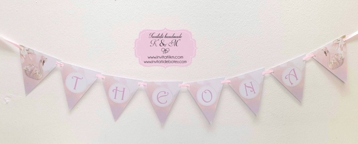 Ghirlanda cu numele copilului cu print cu lebede. Culorile si formele se pot modifica. Pot fi folosite la decorarea camerei copilului sau la botez, pentru candy bar