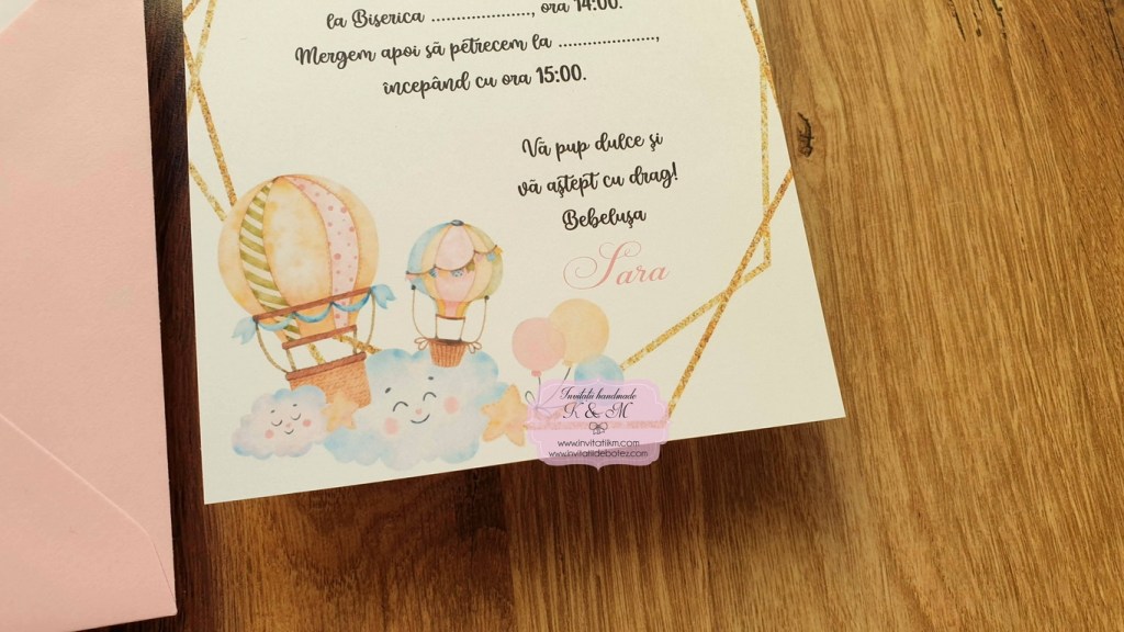 Invitatii de botez realizate din carton gros alb, print cu chenar geometric si balon cu aer cald pentru fetite, plic inclus cu liner personalizat